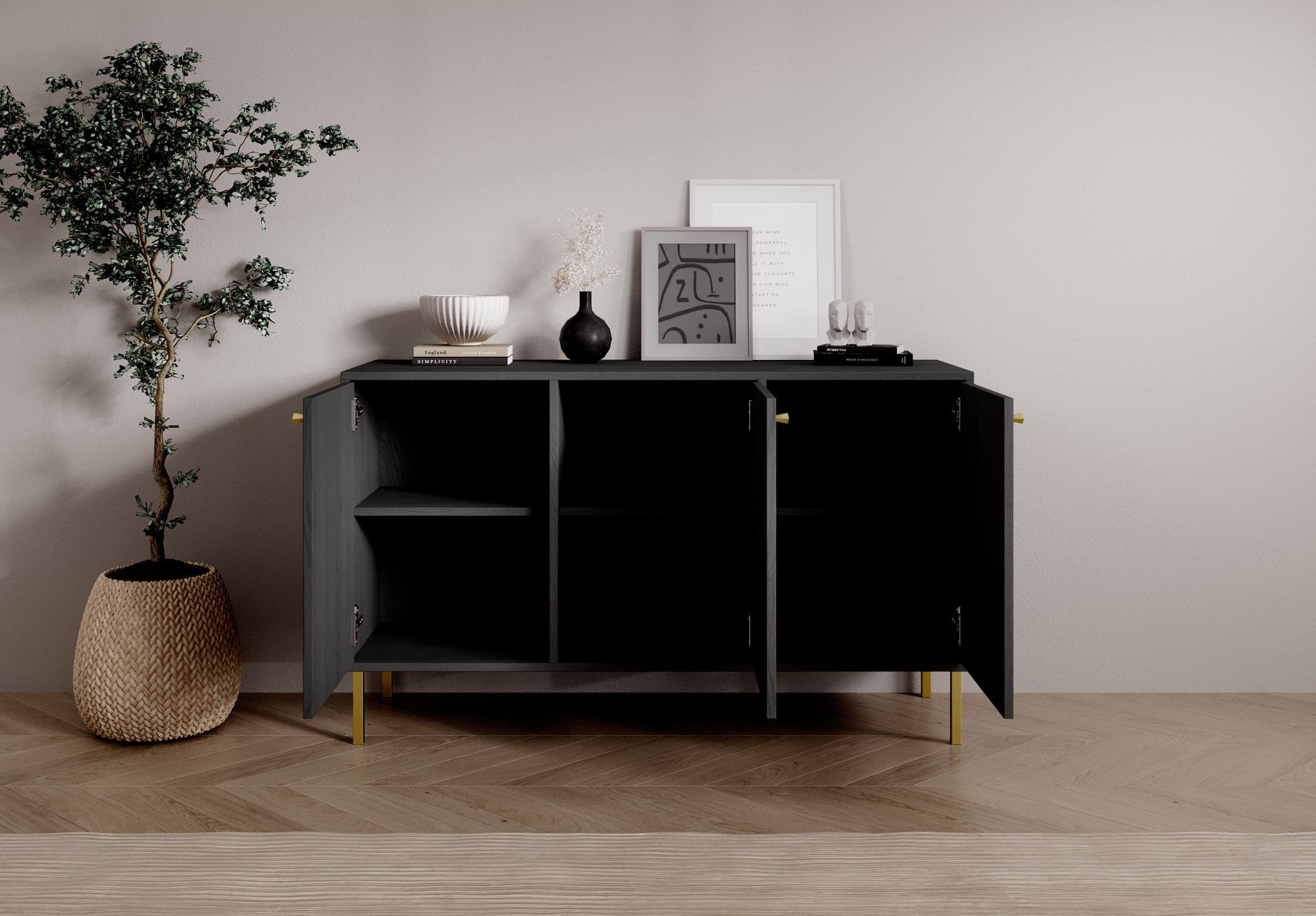 Komoda System Tili je moderní nábytek, který se díky své promyšlené barevnosti a elegantnímu designu dokonale hodí do různorodých interiérů. Dostupná ve třech barevných variantách: **černá**, **písková béžová** a **eukalyptus**, komoda představuje harmonické spojení funkčnosti a estetiky.Každá barevná varianta byla pečlivě navržena, aby zdůraznila jedinečný charakter interiéru. **Černá** dodává komodě sofistikovaný, moderní vzhled, ideální pro minimalistické a elegantní prostory. **Písečná béžová** přináší teplo a jemnost, dokonale se hodí k světlým, přírodním prvkům interiéru. Zatímco **eukalyptus** je odstín inspirovaný přírodou, který přináší do interiéru svěžest a lehkost, ideální pro moderní i více klasické aranžmá.