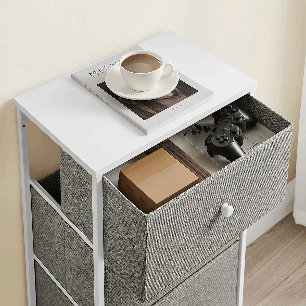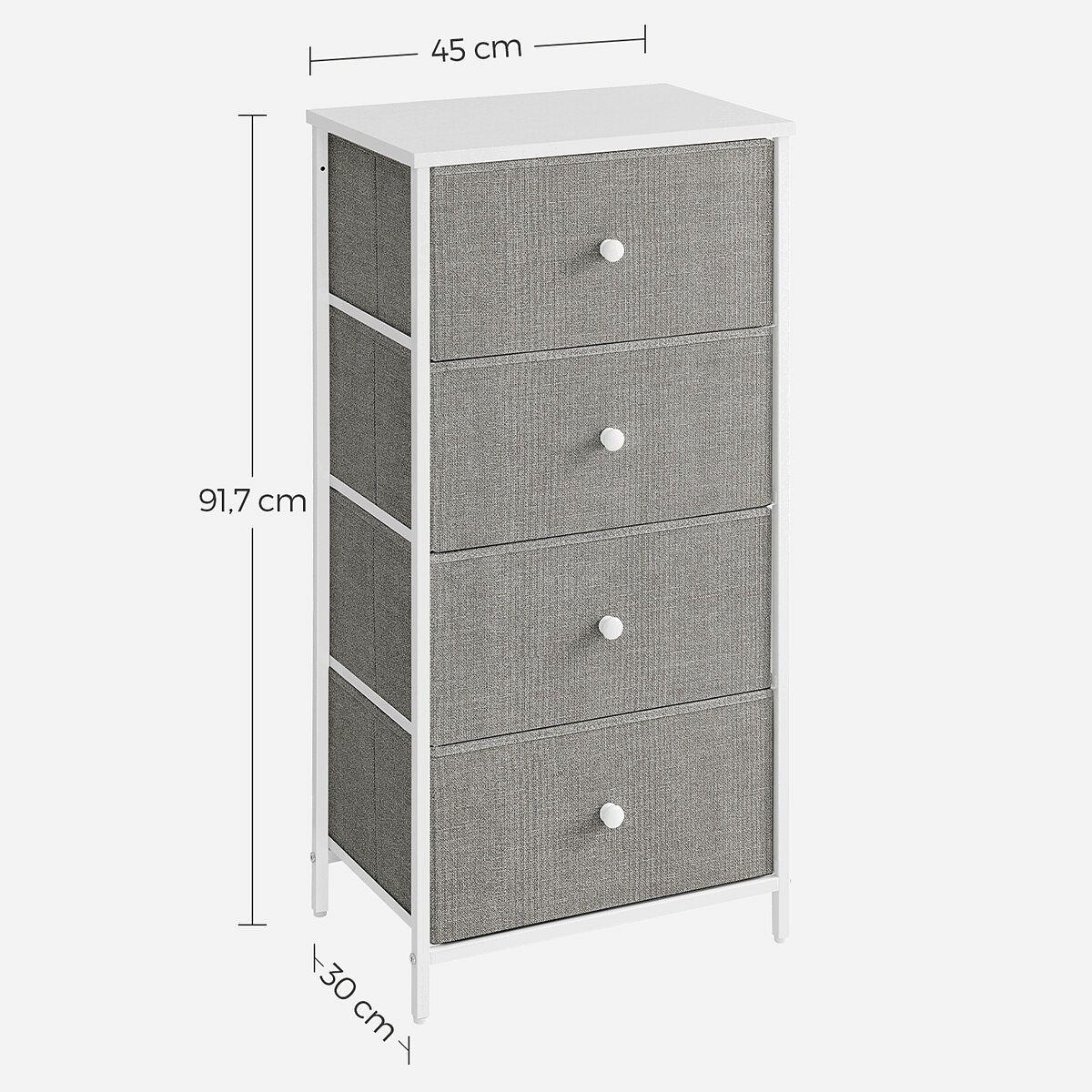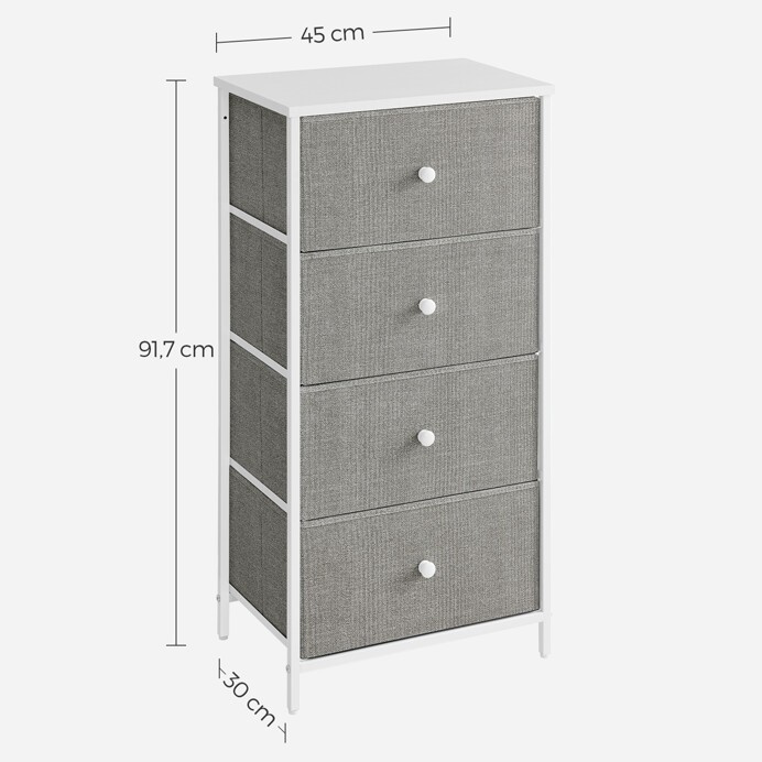 Komoda o rozměrech 45x30x92 cm kombinuje pevnou MDF desku s matnou povrchovou úpravou v bílé barvě a stabilní kovovou konstrukci nohou. Čtyři prostorné zásuvky z netkané textilie v šedém odstínu poskytují praktický úložný prostor pro různé drobnosti a zároveň usnadňují organizaci. Jednoduchý design s decentními bílými úchytkami ladí s moderním i skandinávským stylem interiéru. Komoda je navržena tak, aby byla lehká a zároveň dostatečně pevná pro každodenní použití. Díky kompaktním rozměrům se hodí do menších prostor, kde je potřeba efektivně využít místo.