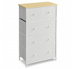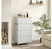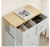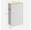 Komoda o rozměrech 56x30x93 cm kombinuje pevnou MDF desku s matným dubovým dekorem a stabilní kovovou konstrukci v bílém provedení. Čtyři prostorné látkové zásuvky z netkané textilie poskytují praktický úložný prostor, který je lehký a snadno přístupný díky kulatým úchytkám. Kovové nohy zajišťují pevnou oporu a stabilitu celé komody, zatímco matný povrch desky usnadňuje údržbu a odolává běžnému opotřebení. Komoda je vhodná do moderních i klasických interiérů, kde oceníte kombinaci funkčnosti a jednoduchého designu.