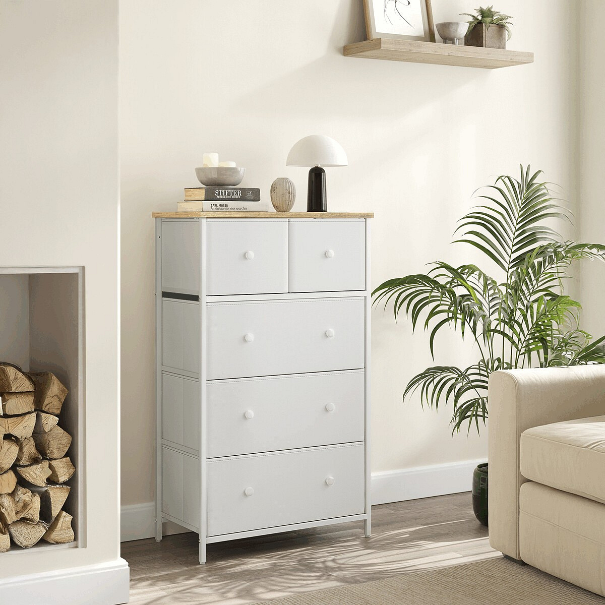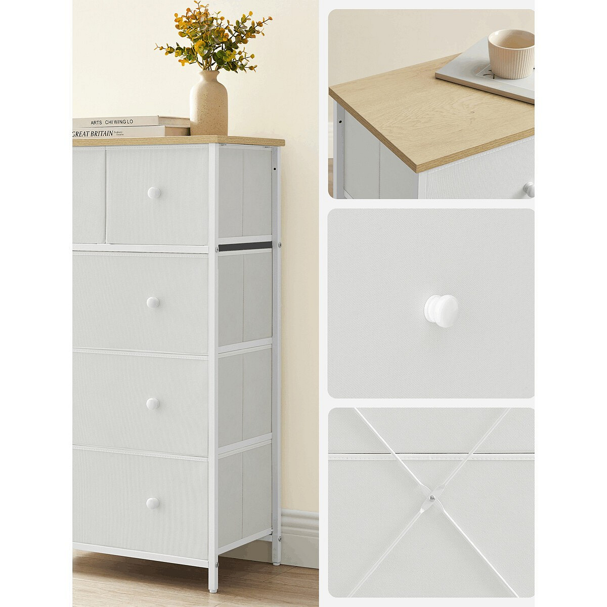 Komoda o rozměrech 56x30x93 cm kombinuje pevnou MDF desku s matným dubovým dekorem a stabilní kovovou konstrukci v bílém provedení. Čtyři prostorné látkové zásuvky z netkané textilie poskytují praktický úložný prostor, který je lehký a snadno přístupný díky kulatým úchytkám. Kovové nohy zajišťují pevnou oporu a stabilitu celé komody, zatímco matný povrch desky usnadňuje údržbu a odolává běžnému opotřebení. Komoda je vhodná do moderních i klasických interiérů, kde oceníte kombinaci funkčnosti a jednoduchého designu.