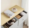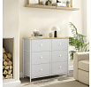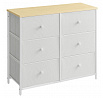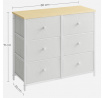 Komoda o rozměrech 80x30x71 cm kombinuje pevnou kovovou konstrukci s matnou MDF deskou v dekoru dub, která dodává nábytku přírodní vzhled. Šest prostorných zásuvek z netkané textilie nabízí praktický úložný prostor pro různé drobnosti a zároveň usnadňují organizaci. Kovové nohy zajišťují stabilitu a dlouhou životnost, zatímco lehký materiál zásuvek přispívá k snadné manipulaci. Matný povrch desky je odolný vůči běžnému opotřebení a snadno se udržuje. Komoda je vhodná do moderních i minimalistických interiérů, kde oceníte funkčnost i jednoduchý design.