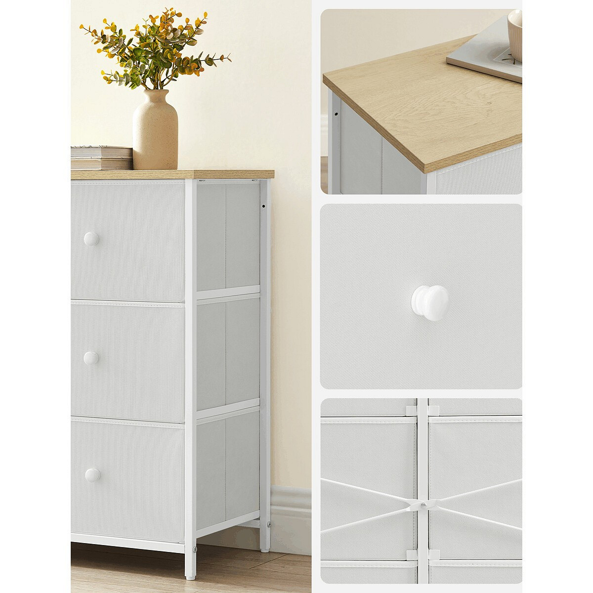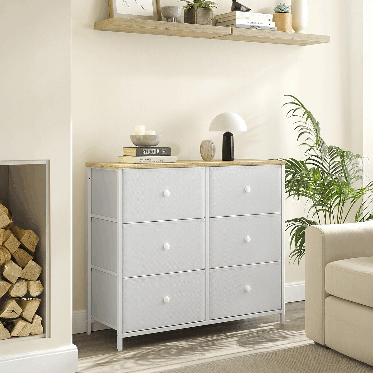 Komoda o rozměrech 80x30x71 cm kombinuje pevnou kovovou konstrukci s matnou MDF deskou v dekoru dub, která dodává nábytku přírodní vzhled. Šest prostorných zásuvek z netkané textilie nabízí praktický úložný prostor pro různé drobnosti a zároveň usnadňují organizaci. Kovové nohy zajišťují stabilitu a dlouhou životnost, zatímco lehký materiál zásuvek přispívá k snadné manipulaci. Matný povrch desky je odolný vůči běžnému opotřebení a snadno se udržuje. Komoda je vhodná do moderních i minimalistických interiérů, kde oceníte funkčnost i jednoduchý design.