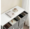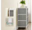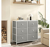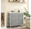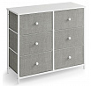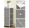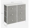 Komoda o rozměrech 80x30x71 cm kombinuje pevnou MDF desku s matnou bílou povrchovou úpravou a stabilní kovovou konstrukcí v šedé barvě. Šest prostorných zásuvek z netkané textilie nabízí praktické úložné řešení s jednoduchým přístupem díky kulatým úchytkům. Kovové nohy zajišťují stabilitu a odolnost, zatímco lehká látková provedení zásuvek usnadňují manipulaci a přispívají k vzdušnému vzhledu komody. Díky kompaktním rozměrům je vhodná do menších prostor, kde poskytuje dostatek místa pro organizaci drobných předmětů i textilu.
