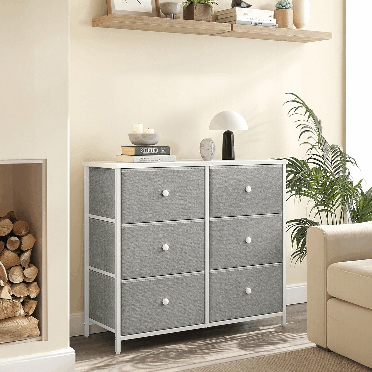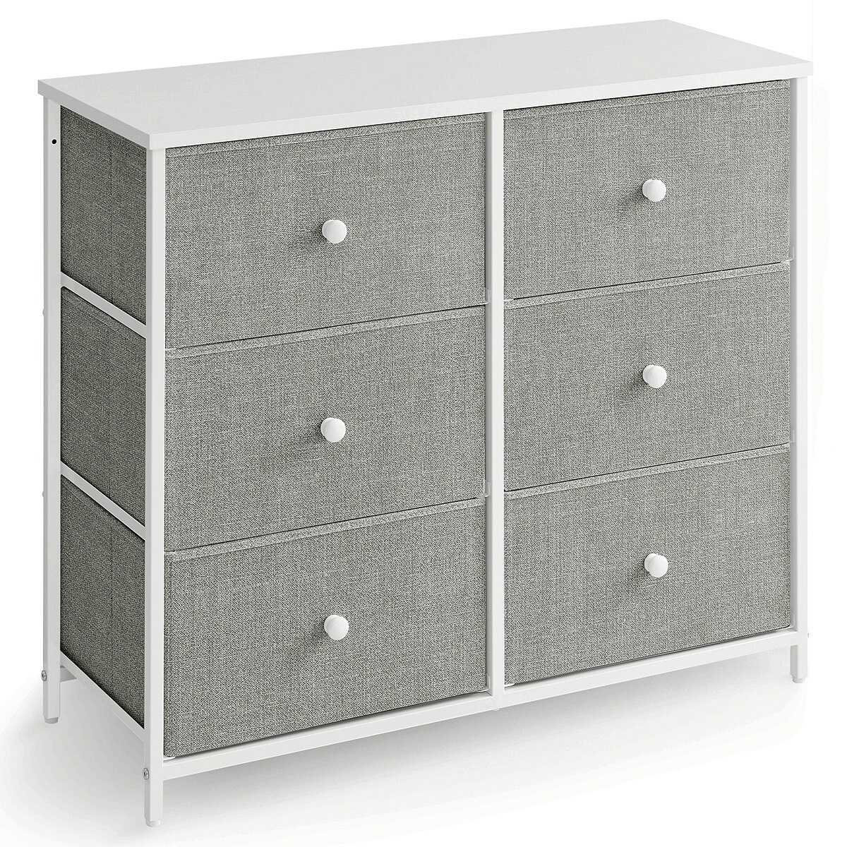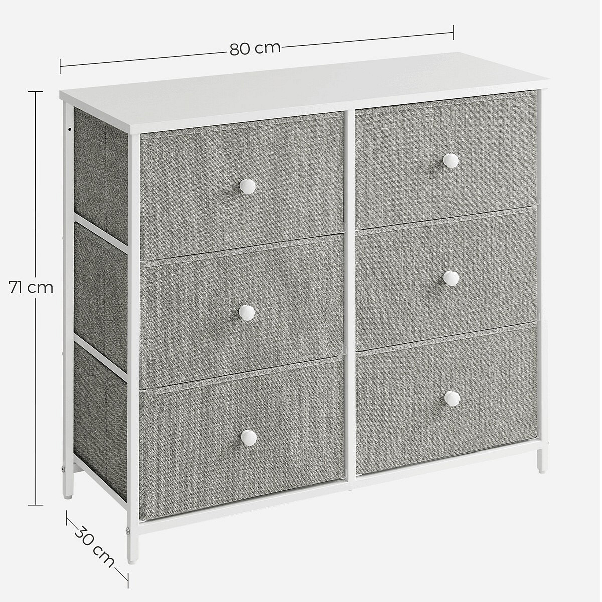 Komoda o rozměrech 80x30x71 cm kombinuje pevnou MDF desku s matnou bílou povrchovou úpravou a stabilní kovovou konstrukcí v šedé barvě. Šest prostorných zásuvek z netkané textilie nabízí praktické úložné řešení s jednoduchým přístupem díky kulatým úchytkům. Kovové nohy zajišťují stabilitu a odolnost, zatímco lehká látková provedení zásuvek usnadňují manipulaci a přispívají k vzdušnému vzhledu komody. Díky kompaktním rozměrům je vhodná do menších prostor, kde poskytuje dostatek místa pro organizaci drobných předmětů i textilu.