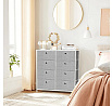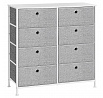 Komoda o rozměrech 80x30x82 cm kombinuje pevnou kovovou konstrukci s deskou z MDF v matném bílém provedení, která zajišťuje stabilitu a snadnou údržbu. Osm látkových zásuvek v šedé barvě nabízí praktický úložný prostor pro různé drobnosti a textilní materiál zásuvek přispívá k lehkému a vzdušnému vzhledu. Kovové nohy jsou vybaveny plastovými krytkami, které chrání podlahu před poškozením. Komoda je vhodná do moderních i minimalistických interiérů, kde oceníte kombinaci funkčnosti a jednoduchého designu.