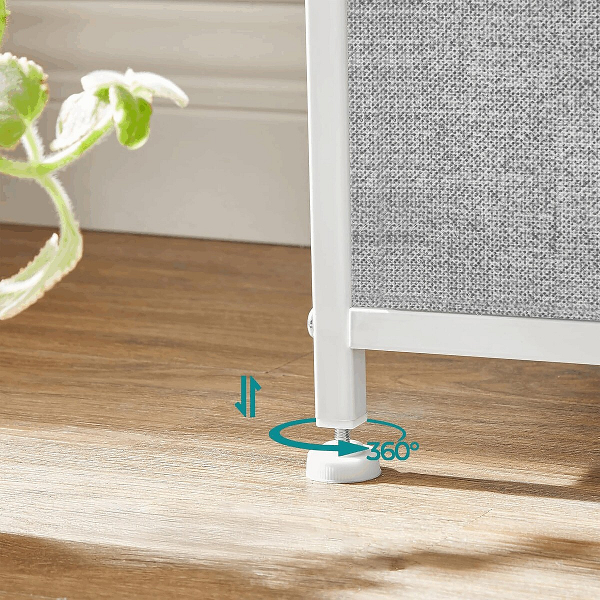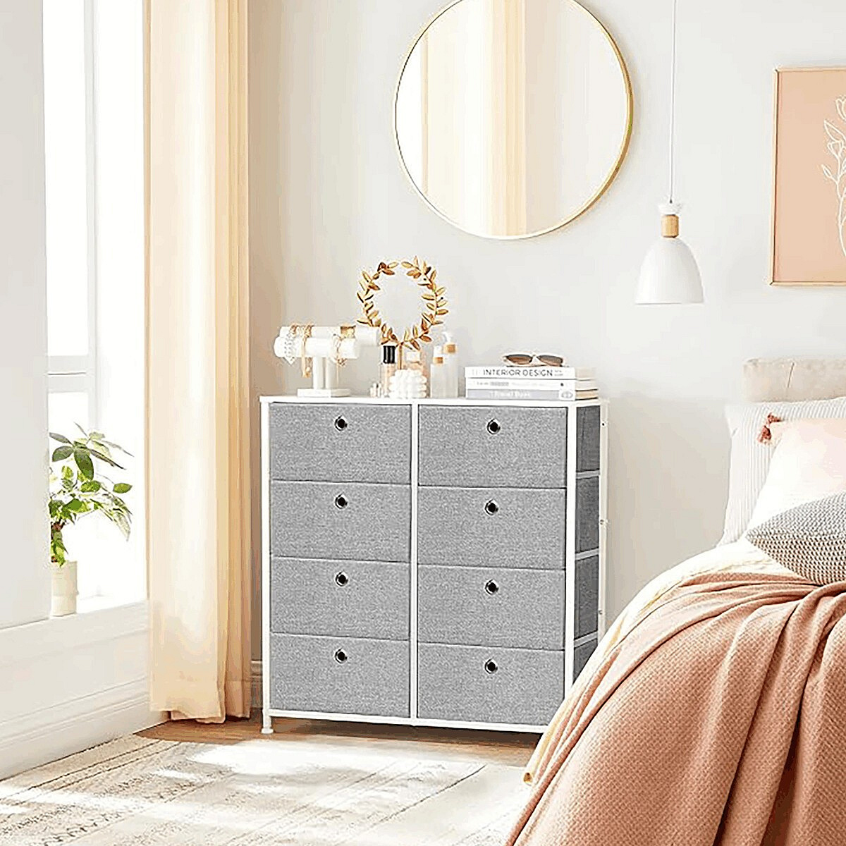 Komoda o rozměrech 80x30x82 cm kombinuje pevnou kovovou konstrukci s deskou z MDF v matném bílém provedení, která zajišťuje stabilitu a snadnou údržbu. Osm látkových zásuvek v šedé barvě nabízí praktický úložný prostor pro různé drobnosti a textilní materiál zásuvek přispívá k lehkému a vzdušnému vzhledu. Kovové nohy jsou vybaveny plastovými krytkami, které chrání podlahu před poškozením. Komoda je vhodná do moderních i minimalistických interiérů, kde oceníte kombinaci funkčnosti a jednoduchého designu.