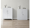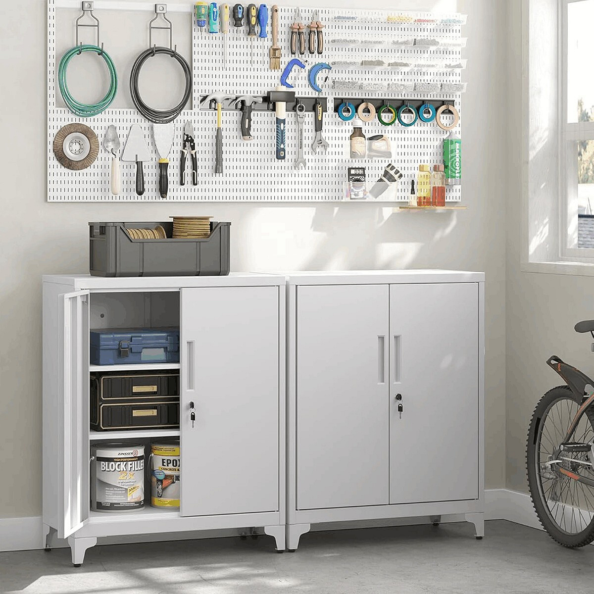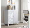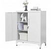 Úložná skříňka o rozměrech 80x40x100 cm je vyrobena z pevného kovu s práškovou povrchovou úpravou v bílé barvě, která zajišťuje odolnost proti poškození a snadnou údržbu. Skříňka nabízí tři vnitřní police, které poskytují dostatek prostoru pro organizaci různých předmětů, a je vybavena dvěma dveřmi s vestavěnými úchytkami pro pohodlné otevírání. Kovové nožky s nastavitelnými patkami zaručují stabilitu i na nerovném povrchu. Praktický zámek na pravých dveřích umožňuje bezpečné uzamčení obsahu. Díky svému jednoduchému designu a neutrální bílé barvě se skříňka hodí do kanceláří i domácích prostor.