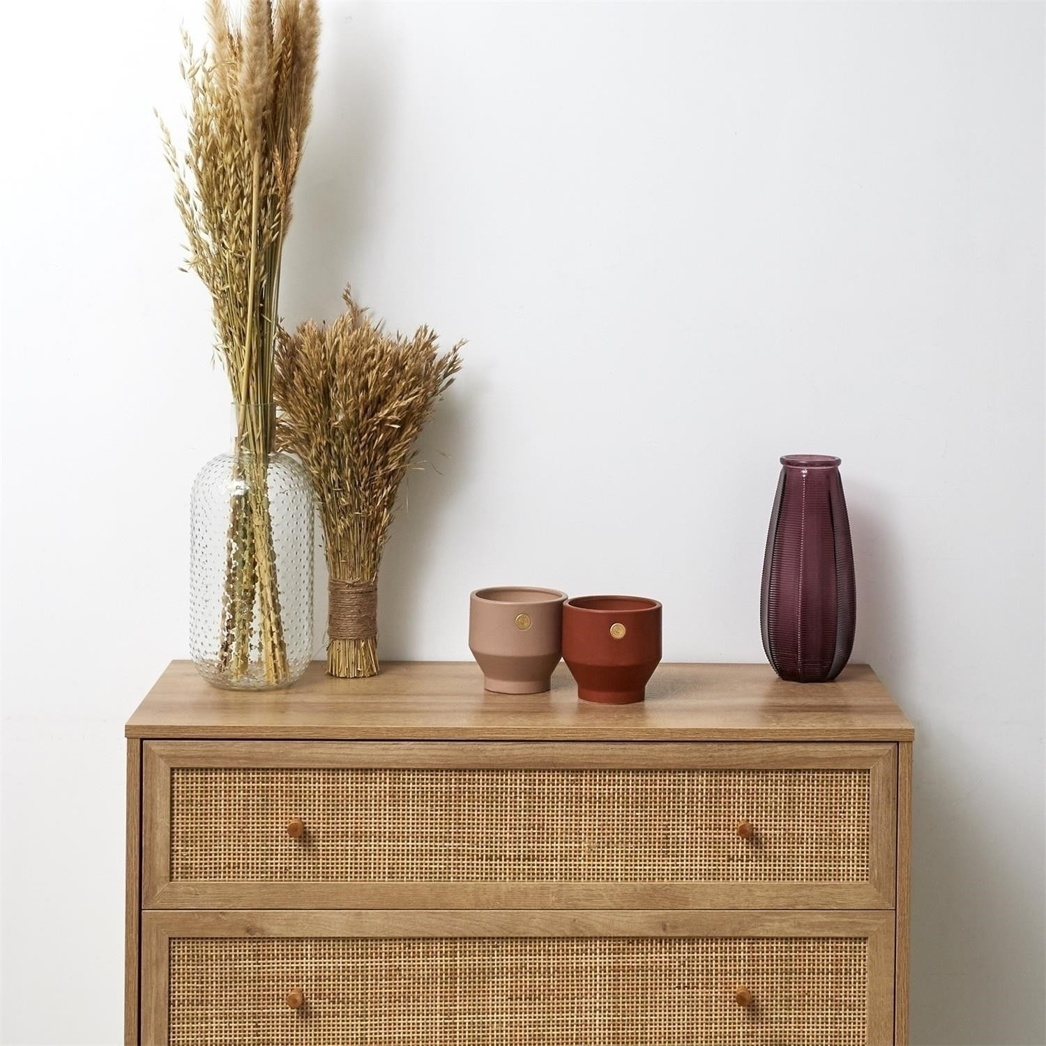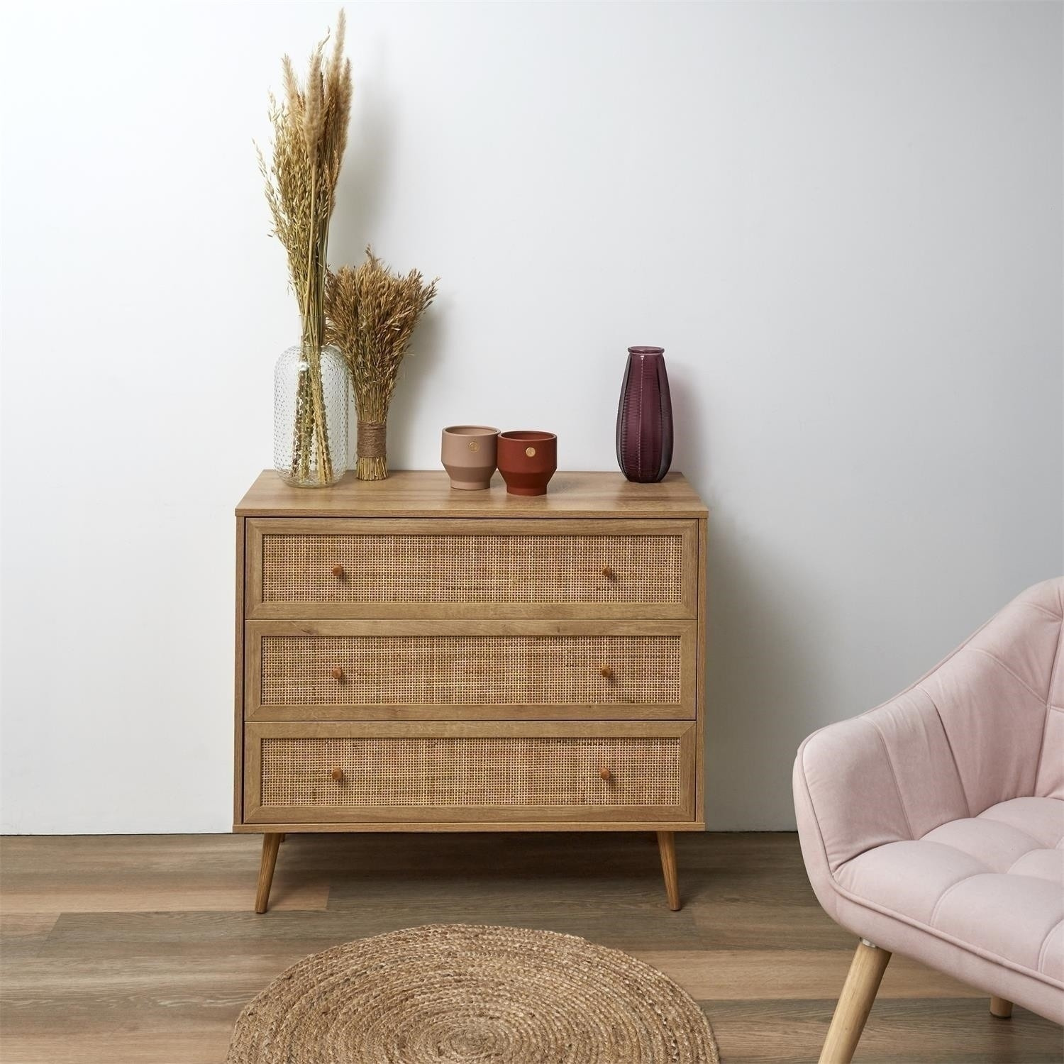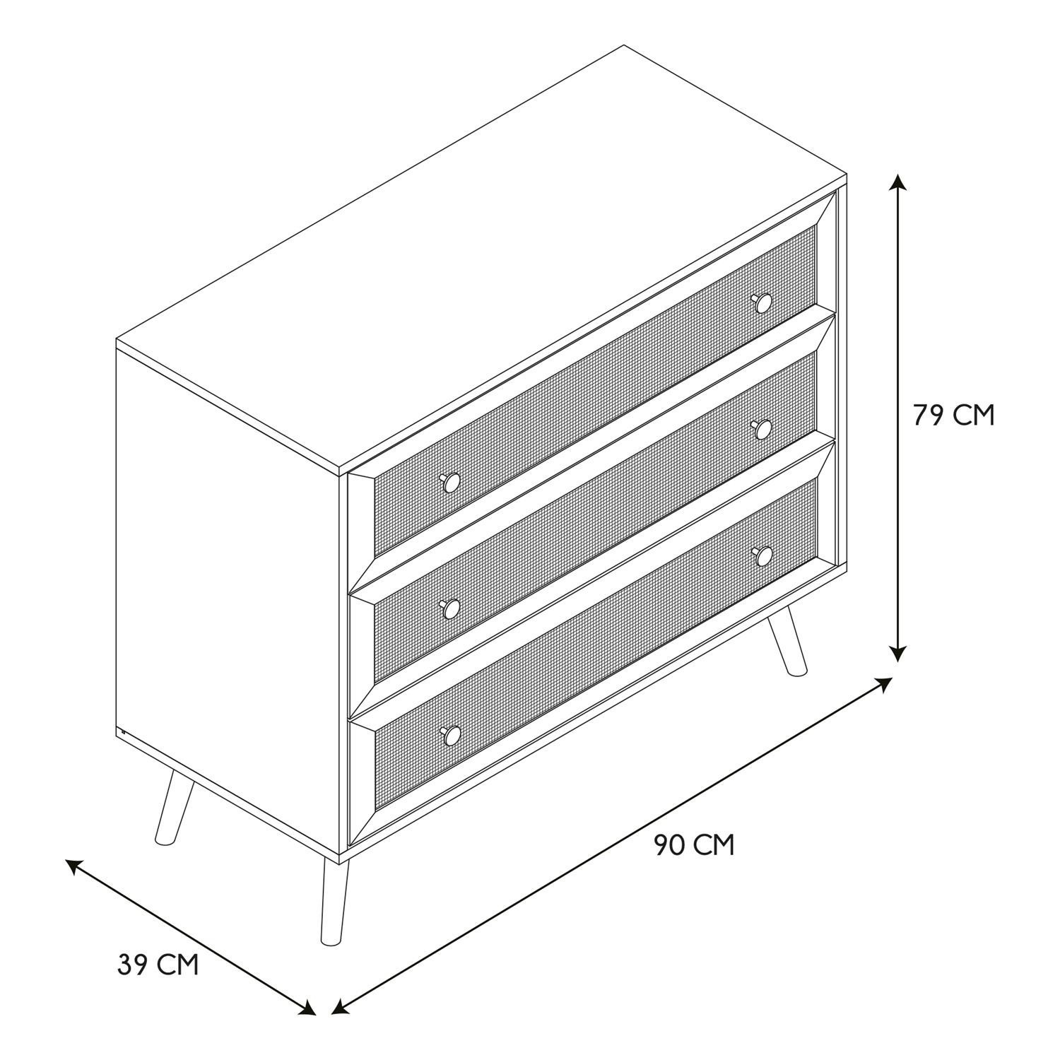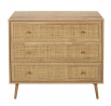 Komoda Bali se třemi zásuvkami je nábytek s pletenými čely ve stylu boho. Základem komody jsou čtyři nohy, které díky své konstrukci zajišťují stabilitu. Komoda Bali bude nejkrásnějším nábytkem ve vašem interiéru, tři prostorné zásuvky pomohou uspořádat prádlo, drobnosti nebo příbory. Neomezené možnosti komody umožňují, aby byla nábytkem nejen do ložnice, ale také do obývacího pokoje ve stylu boho nebo dokonce do kanceláře. - Hlavní složení: dřevotříska. Nábytek vyžaduje vlastní montáž. Rozměry balení: 42 x 15 x 94 cm