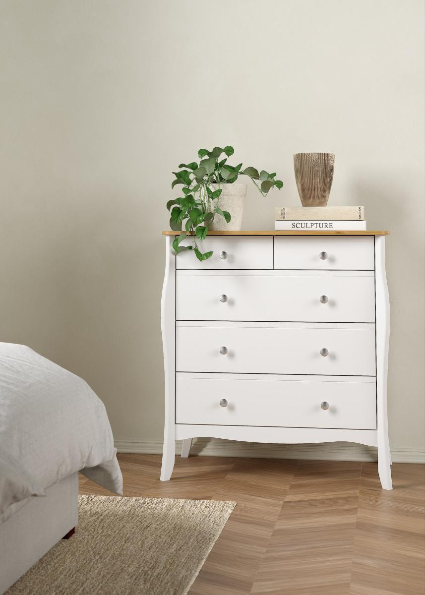 Půvabná série Baroneta dánského výrobce je charakteristická detailními ornamenty a harmonickými tvary s náznakem skandinávského minimalismu. Výrazným prvkem nábytku inspirovaným barokním stylem jsou zakřivené nohy, které přispívají ke stylovému a elegantnímu designu interiéru. Série vyrobená z kvalitních MDF desek obsahuje noční, toaletní stolky, konferenční, TV stolky, komody a šatní skříně ve více barevných variantách.