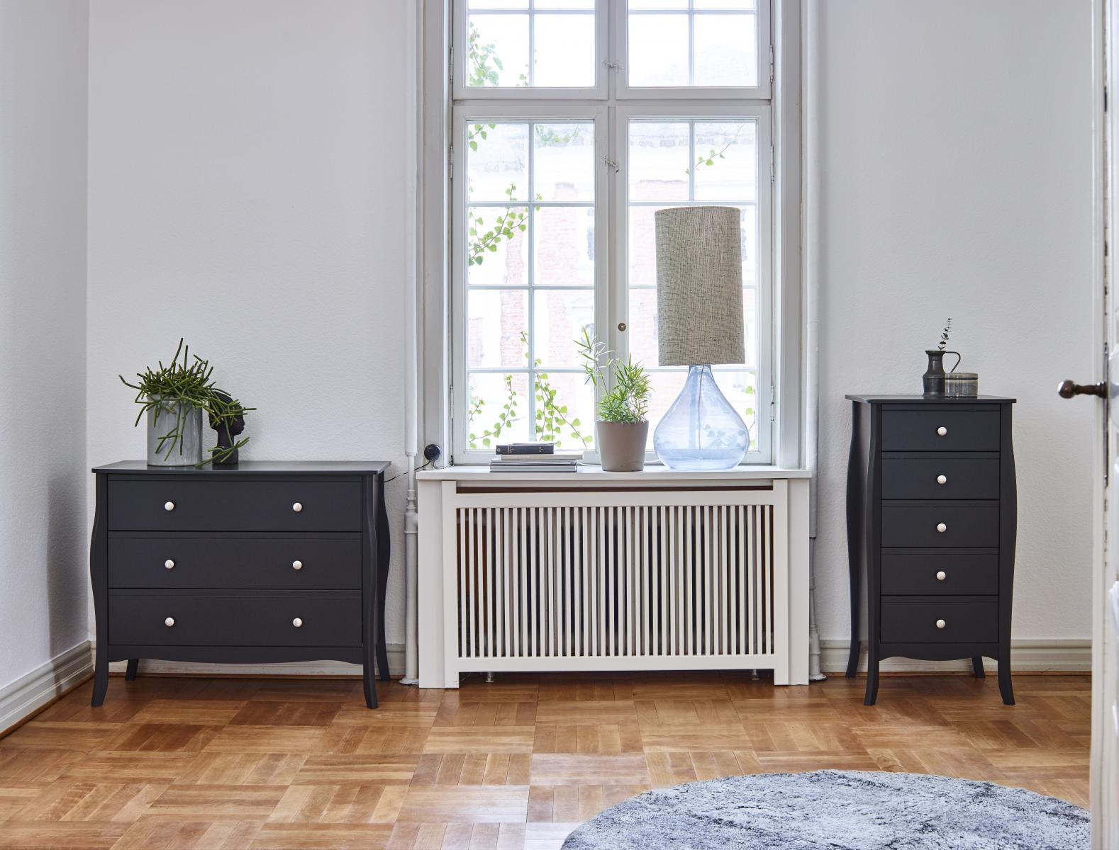 Půvabná série Baroneta dánského výrobce je charakteristická detailními ornamenty a harmonickými tvary s náznakem skandinávského minimalismu. Výrazným prvkem nábytku inspirovaným barokním stylem jsou zakřivené nohy, které přispívají ke stylovému a elegantnímu designu interiéru. Série vyrobená z kvalitních MDF desek obsahuje noční, toaletní stolky, komody a šatní skříně ve více barevných variantách. Zboží je dodáváno v demontu, součástí je schematický návod na montáž.