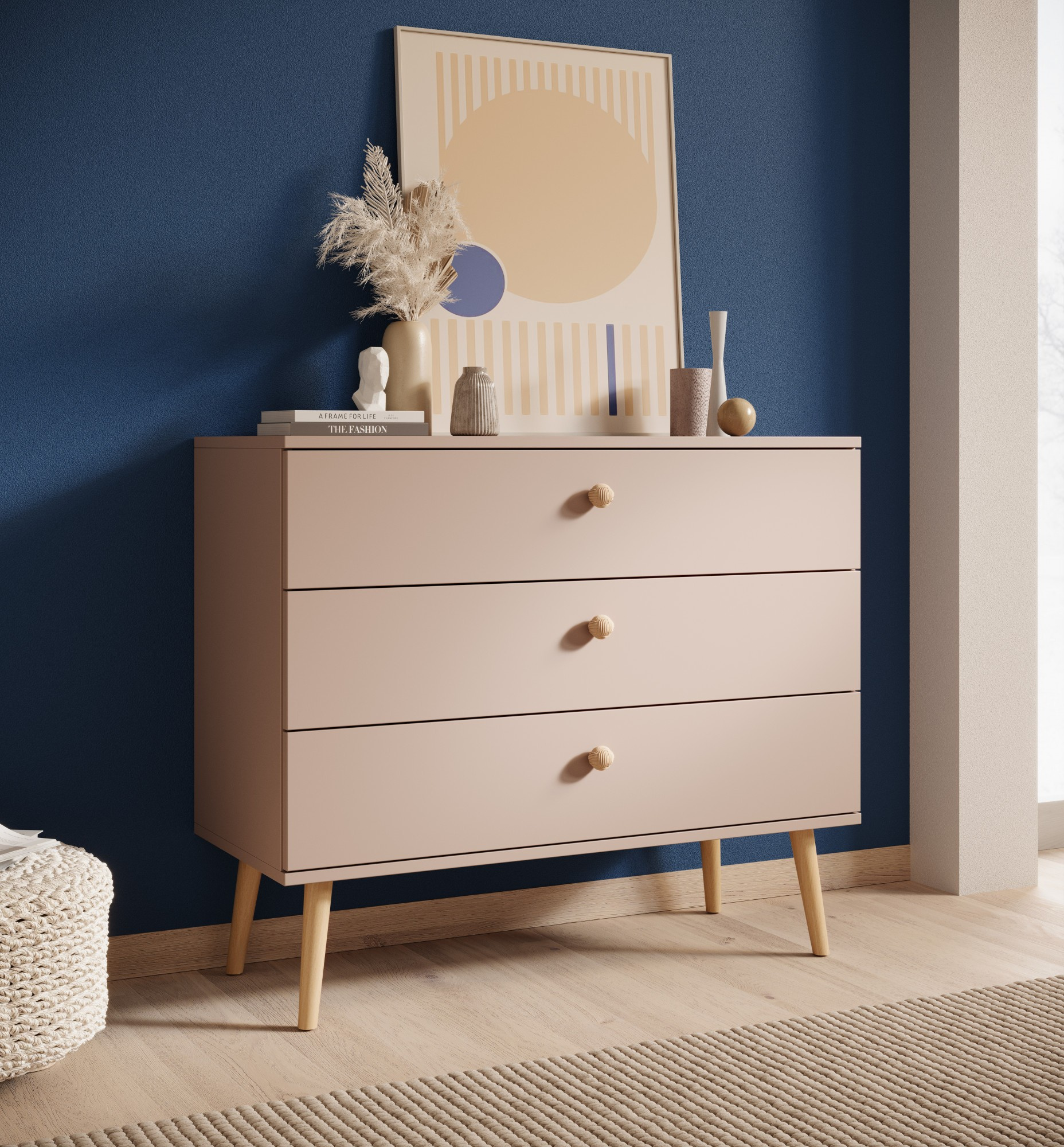 Objev komodu Beni, která spojuje funkčnost s výjimečným stylem! Skandinávský minimalismus v kombinaci s boho detaily, jako jsou dřevěné nožky a provázkové úchyty, činí nábytek vhodným pro každý interiér – od obývacího pokoje po ložnici. Prostorné zásuvky s tichým zavíráním a odolná konstrukce z vysoce kvalitních materiálů zajišťují komfort a dlouhou životnost. Vytvořte teplý, stylový prostor díky této jedinečné komodě a objevte zbytek kolekce!