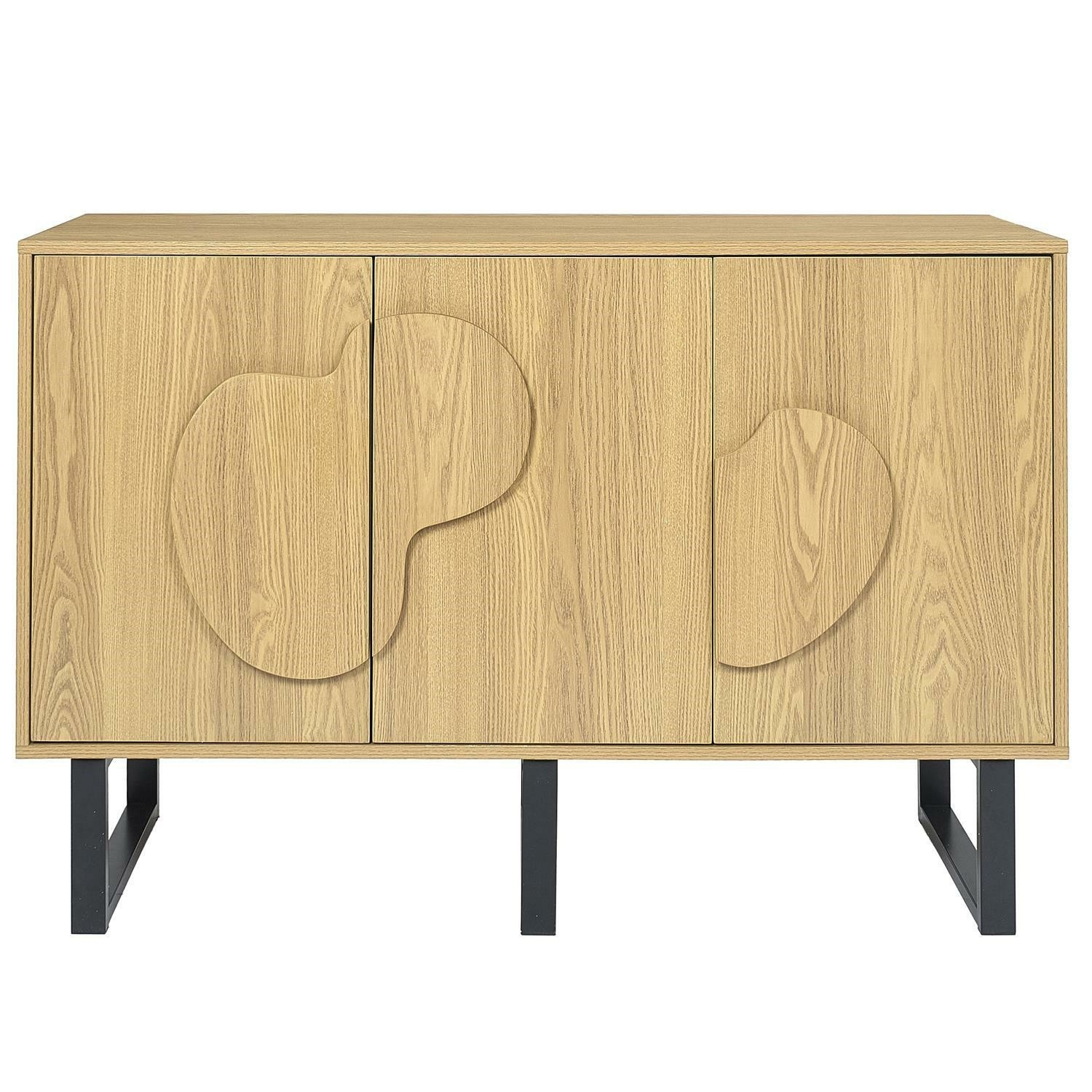 Komoda se 3 čely Calypso je kombinací designu a kvality. Skříňka byla vyrobena z MDF desky s dýhou imitující dub. Čela skříňky vyrobená také z odolné MDF desky, ozdobená dýhou imitující letokruhy a strukturu dřeva. Skříňky nemají tiché dovírání. Tři čela skříněk skrývají za sebou polici. Prostorná komoda ve stylu boho ozdobí každý obývací pokoj, ve kterém dominují přírodní barvy a textury. Úchyty skříněk mají vypouklý nepravidelný tvar, který odkazuje na styl japandi. Základem skříňky jsou nohy ve tvaru lyžin. Nohy byly vyrobeny z kovu lakovaného práškovou barvou. Skříňka vyžaduje montáž. Max. zatížení 40 kg. Hmotnost skříňky 33,6 kg. Rozměry kartonu: 48,5x15,5x127 cm