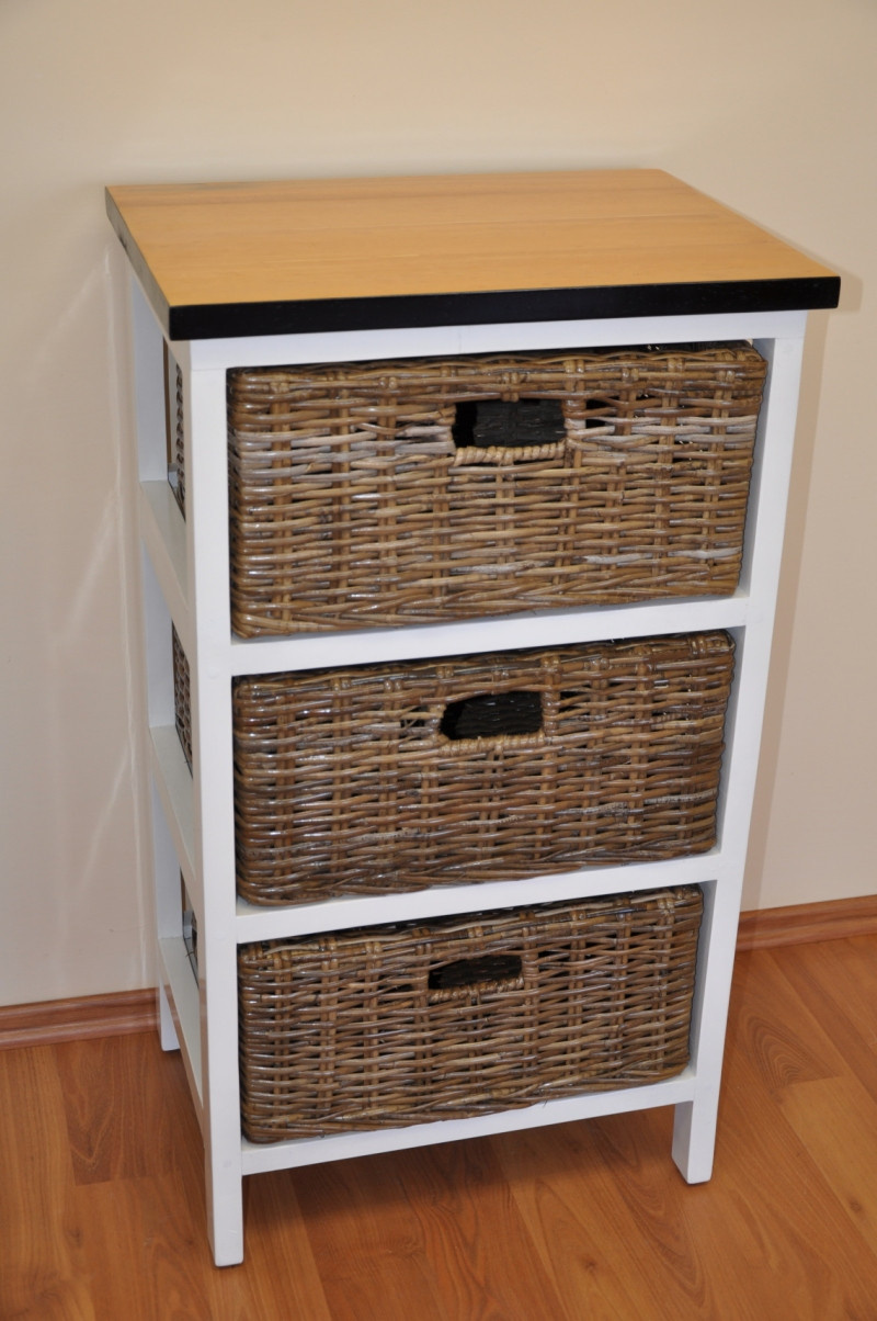 Komoda vyrobená z masivního mahagonového dřeva se zásuvkami z přírodního ratanu kubu v přírodní šedé barvě. | Barva dřevěné konstrukce je bílá s přírodní lakovanou horní deskou. Ratanové zásuvky jsou vyrobeny z ratanu kubu v přírodní šedé barvě. Velikost komody je 49x36,5x86 cm