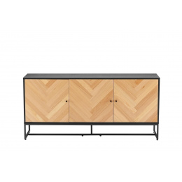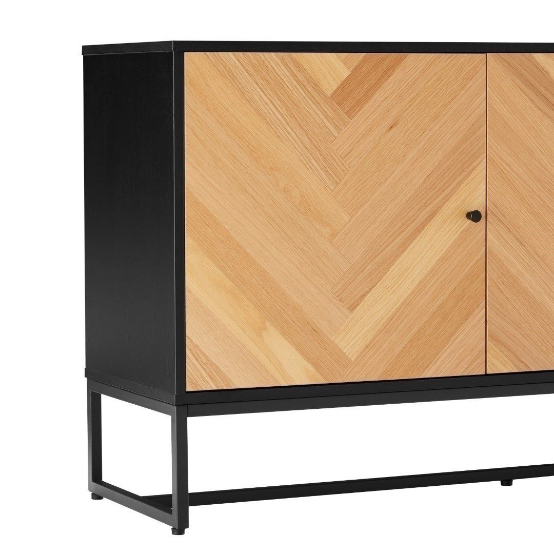 Komoda na kovové základně, která spojuje moderní design s přírodním kouzlem. Čela skříněk imitující dřevo v rybí kost dodávají interiéru útulnost, zatímco černé tělo přidává eleganci a kontrast. Ideální nabídka pro ty, kteří si cení stylu a funkčnosti v jednom. Kovový rám lakovaný práškovou barvou na černo. Korpus a čela vyrobené z MDF s dýhou imitující dub. Vyžaduje montáž. Skříňka s funkcí tichého dovírání. Rozměry kartonu: 172x50x11cm a 85x60x14cm