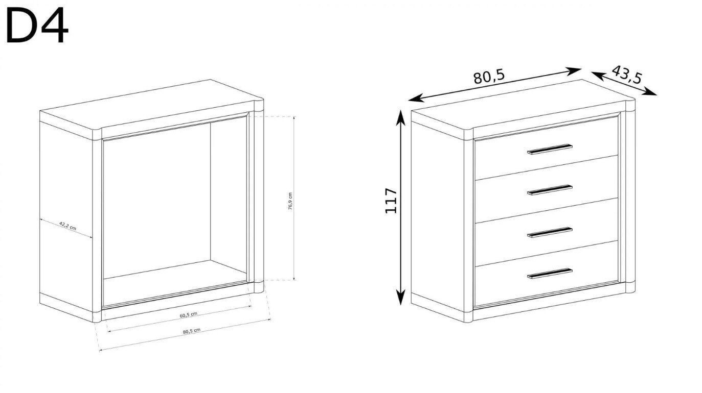 Komoda z kolekce Dallas se čtyřmi prostornými zásuvkami, které pomáhají při každodenní organizaci a umožňují udržovat pořádek a čistotu. Nábytek je jednoduchý, ale díky černým lamelám se stává originálním, boří standardy a šokuje. Kovové úchytky dokonale ladí s komodou jako celkem. Pojme mnoho oblečení a doplňků, najde si své místo v každé místnosti a všude zapadne. K dostání ve dvou barevných provedeních.