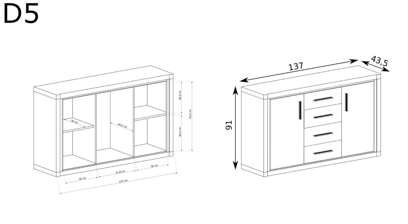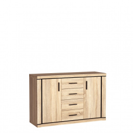 Prostorná komoda z kolekce Dallas, která usnadňuje každodenní organizaci. Komoda má čtyři velké zásuvky a dvě skříňky, každá s jednou policí, které rozdělují obrovský prostor a umožňují jeho správu. Nábytek zdobí černé vložky v podobě lamel, které dodávají komodě spoustu elegance a vnášejí do interiéru originální dekor. Kovové úchytky dokonale ladí s lamelami a vytvářejí zajímavou kombinaci, která mnohé překvapí. Komoda se bude hodit do obývacího pokoje, ložnice, ale i do kanceláře nebo pracovny. K dostání ve dvou barevných provedeních.