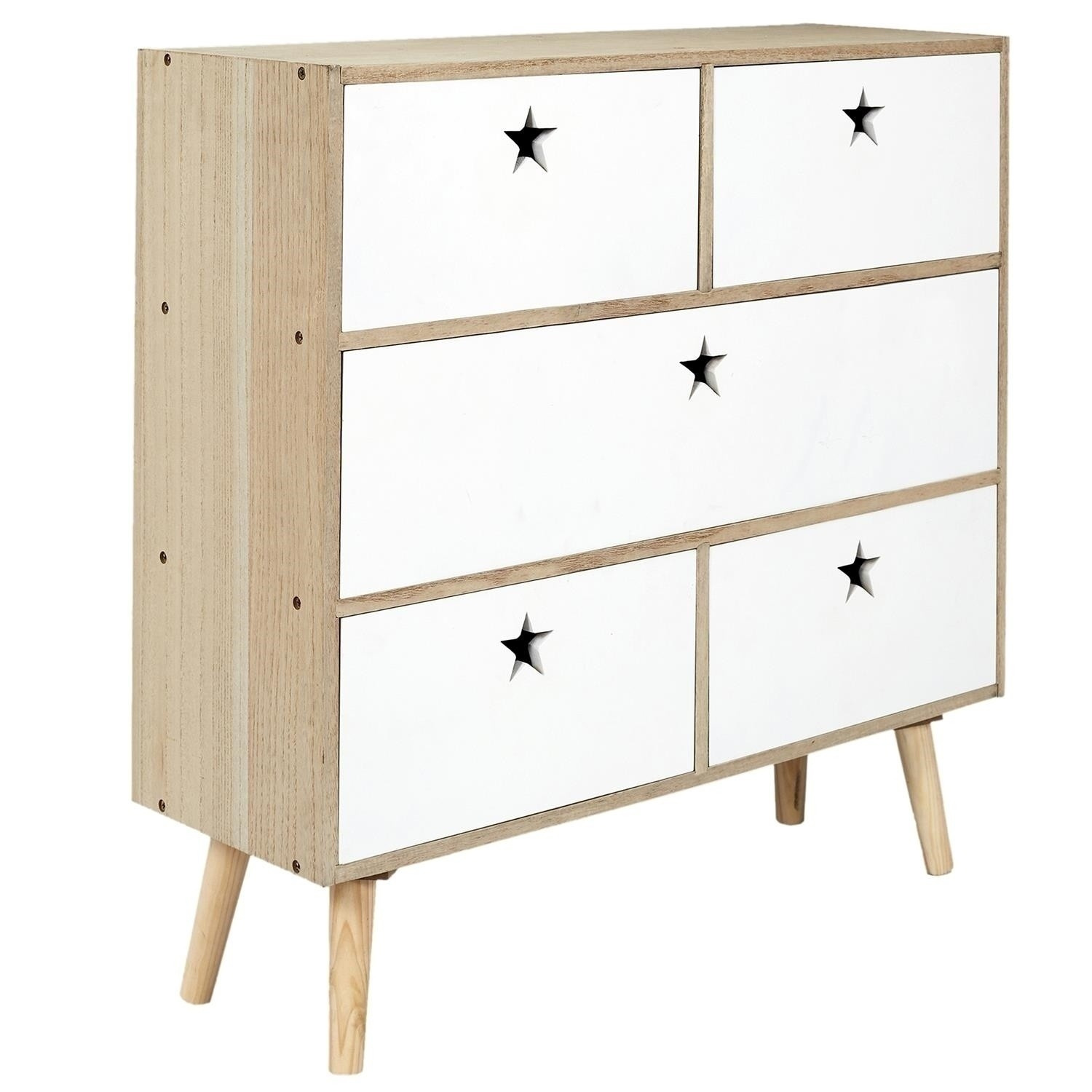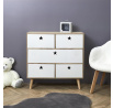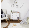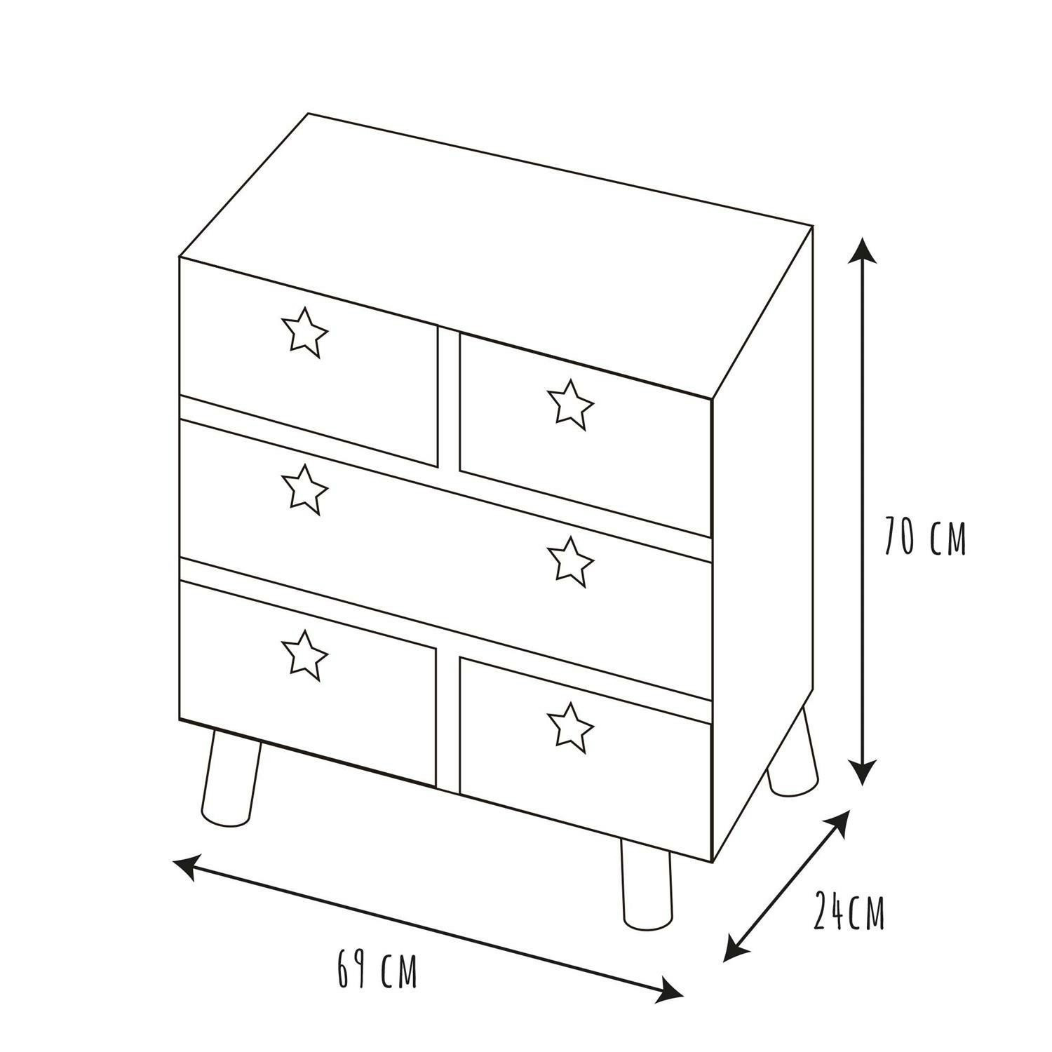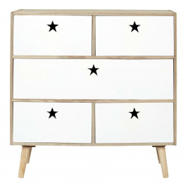 Komoda do dětského pokoje Etoile je prostorný nábytek, který udrží v pořádku oblečení, boty nebo hračky. Komoda vyrobená z bílých čel a korpusu v barvě dřeva byla umístěna na čtyřech borovicových nohách, které se jemně rozcházejí do stran. Komoda je vybavena pěti zásuvkami. Na každé čelní straně zásuvky byl místo standardní rukojeti vyříznut úchyt ve tvaru hvězdičky. Korpus a čela nábytku byly vyrobeny z MDF desky. Vyžaduje montáž: ano Rozměry balení: 61x73x12cm Hmotnost: 16,5 kg