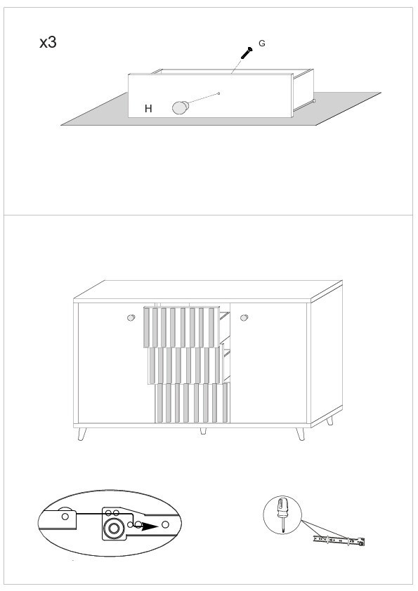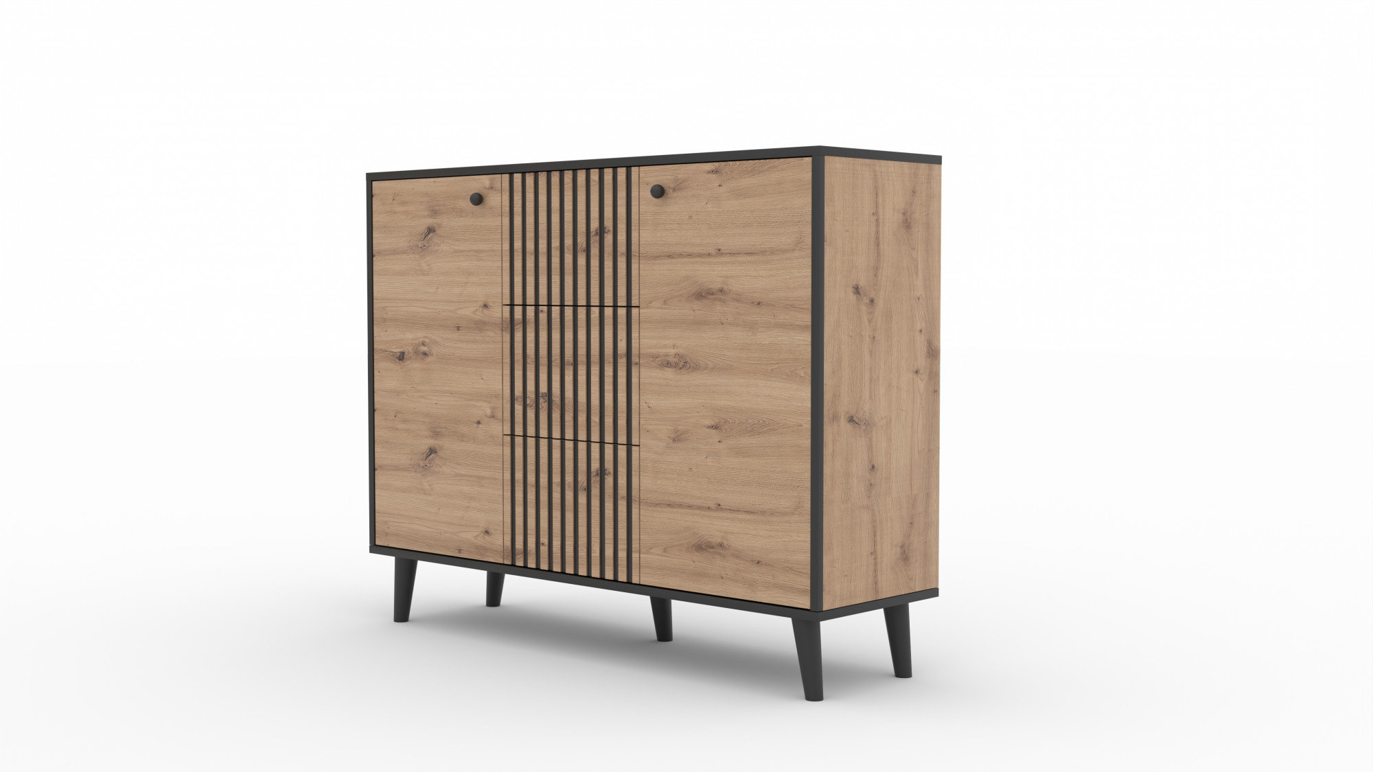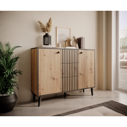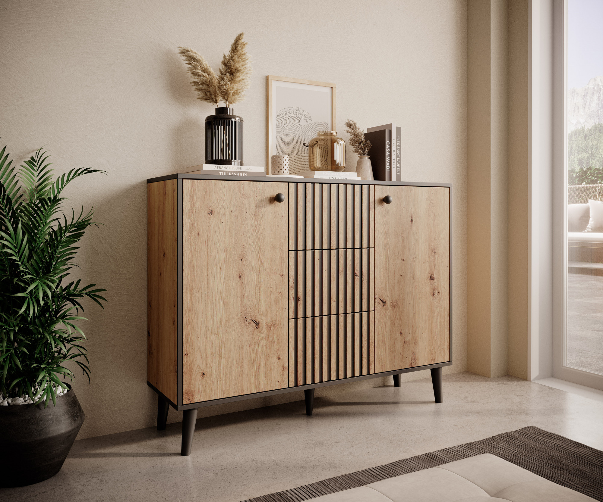 Komoda FADI je ideální kombinací minimalistického designu a lehké formy. Na kouzlu přidávají dřevěné, vysoké nožky, díky kterým je konstrukce stabilní a pevná. Tři prostorné zásuvky umožní uschovat drobnosti či dokumenty, zatímco dvě boční skříňky s policí uvnitř přidají další prostor. Komoda FADI se ideálně hodí do vašeho obývacího pokoje, ložnice nebo předsíně.