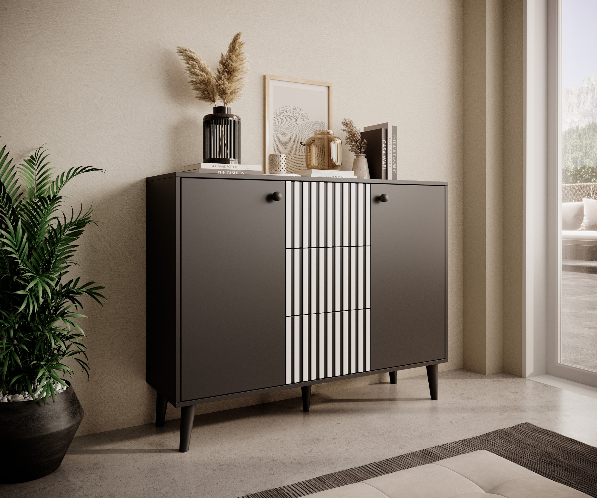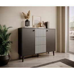 Komoda FADI je ideální kombinací minimalistického designu a lehké formy. Na kouzlu přidávají dřevěné, vysoké nožky, díky kterým je konstrukce stabilní a pevná. Tři prostorné zásuvky umožní uschovat drobnosti či dokumenty, zatímco dvě boční skříňky s policí uvnitř přidají další prostor. Komoda FADI se ideálně hodí do vašeho obývacího pokoje, ložnice nebo předsíně.