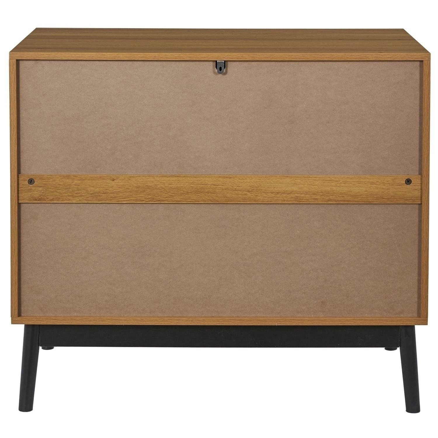Komoda Felix je kombinací retro stylu s moderními řešeními. Nohy nábytku mírně rozbíhající se ven odkazují na skandinávský styl. Komoda je kombinací zajímavých čel ve vzoru rybí kosti a černých jednoduchých nohou. Komoda je vybavena 3 zásuvkami na kuličkových pojezdech. Úchyty jsou kovové rukojeti lakované na zlatou barvu. Konzole vyžaduje montáž. Hmotnost 33 kg Materiál: nohy z borovicového dřeva lakované na černo Korpus a čela: dřevotříska zdobená dýhou imitující dub Max. zatížení desky 30 kg