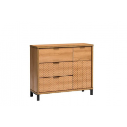 Funkční komoda z kolekce FONTI. I přes své menší rozměry pojme spoustu věcí! Na levé straně jsou 3 prostorné zásuvky na oblečení, spodní prádlo, drobnosti a na pravé straně je skříňka s policí, která rozděluje prostor na polovinu. K dostání v barvě dub karamel.