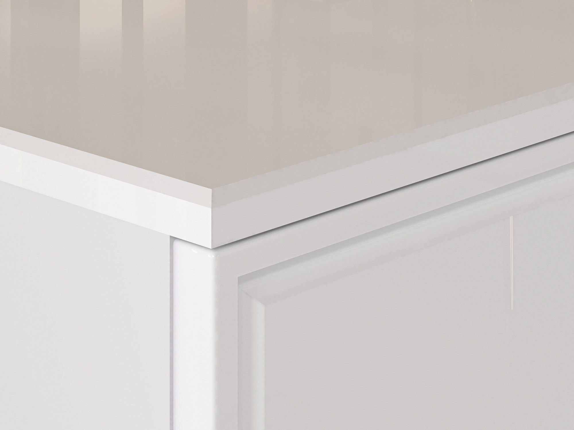 - Frézovaná MDF deska v bílém lesku je použita na dvířkách a vrchních částech nábytku