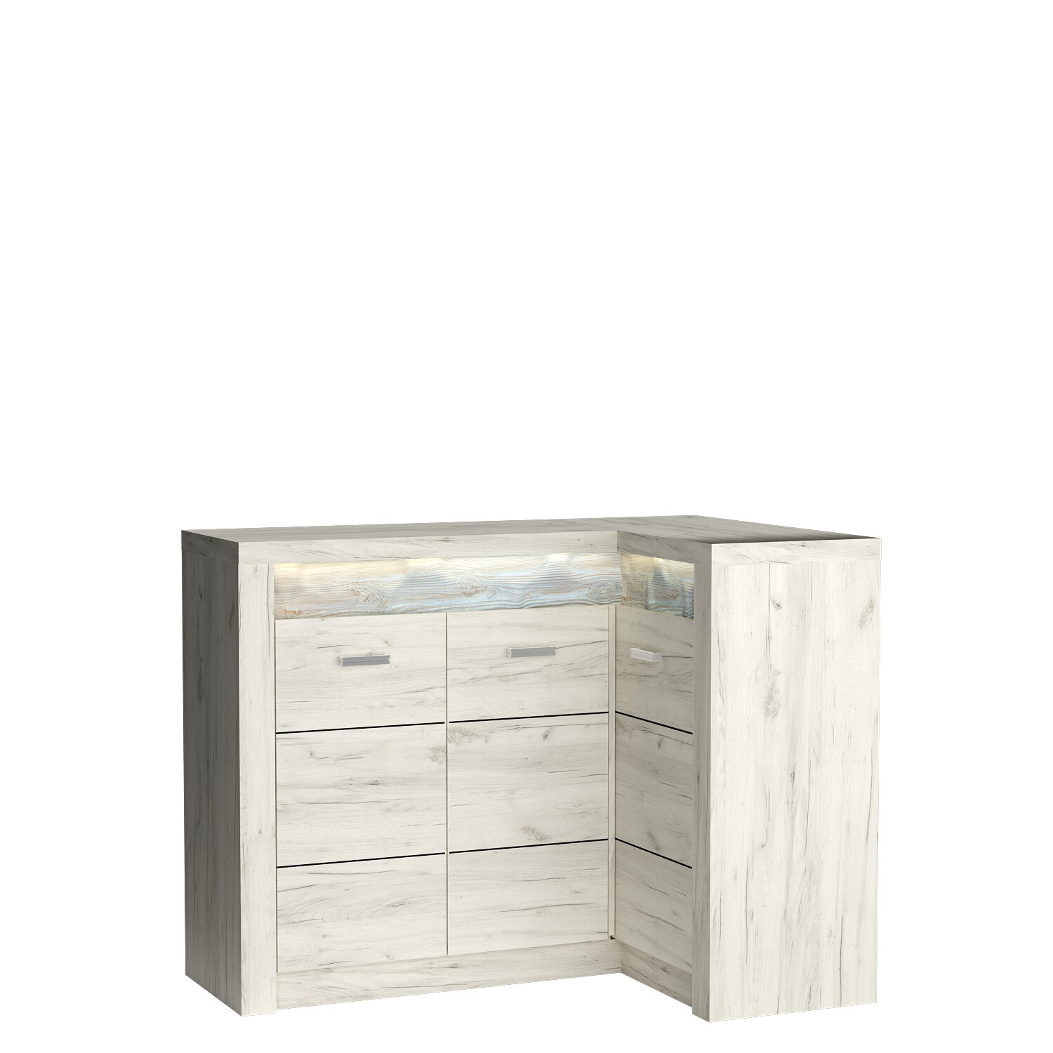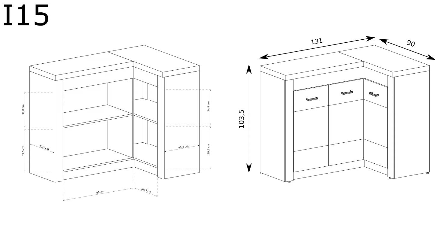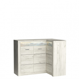 Rohová komoda z kolekce Indianapolis. Skříňky na levé straně jsou spojené a tvoří jeden celek. Je v ní jedna prostorná police, stejně jako na pravé straně. Komoda nabízí mnoho možností svého využití. Je prostorná, organizace je snadná a komoda se vejde do každého rohu. K dispozici je také obrácená verze nábytku. Kovové úchytky dokonale ladí s celým nábytkem a ukazují, jak promyšlený je každý detail. K dostání ve třech barevných provedeních.