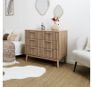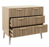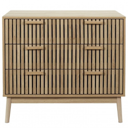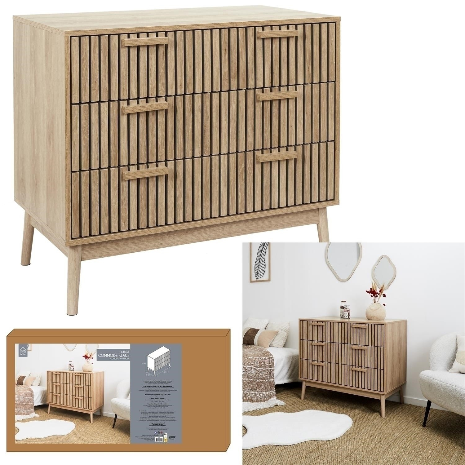 Komoda Klaus je kombinací módní barvy dýhy imitující přírodní barvu borovicového dřeva a módních a klasických lamel. Korpus a čela komody byly vyrobeny z MDF desky, zatímco nohy komody z borovicového dřeva. Komoda je vybavena třemi zásuvkami, které se vysouvají na kovových lištách. Komoda vyžaduje montáž Rozměry kartonu: 96x19x53cm Hmotnost: 39kg.