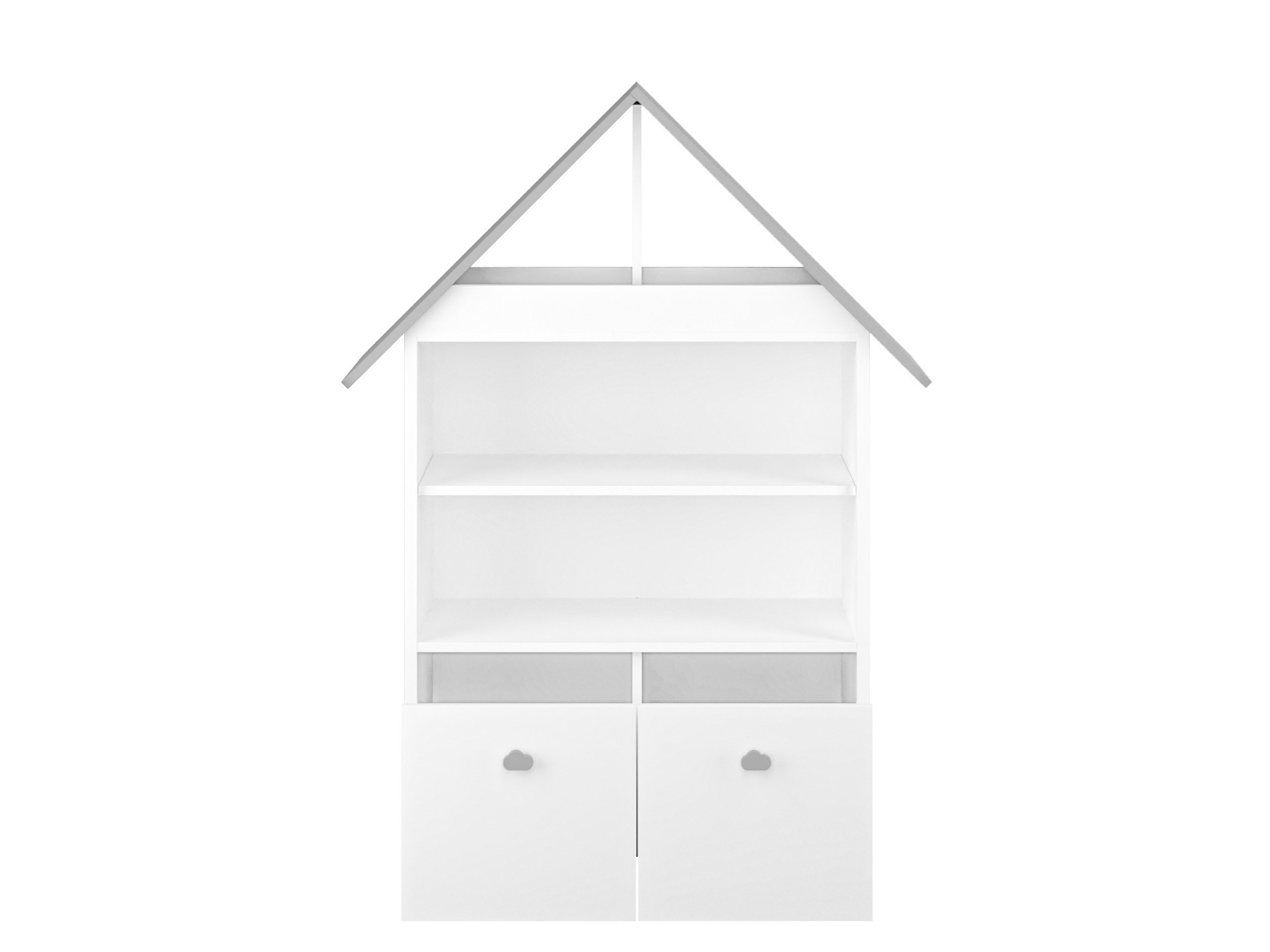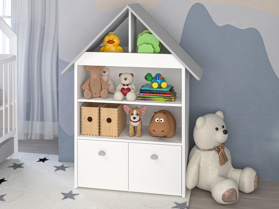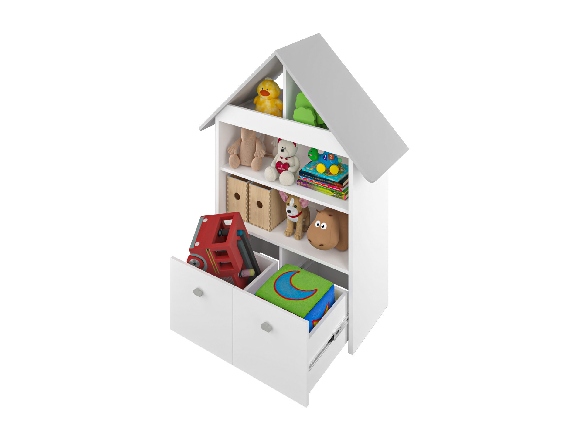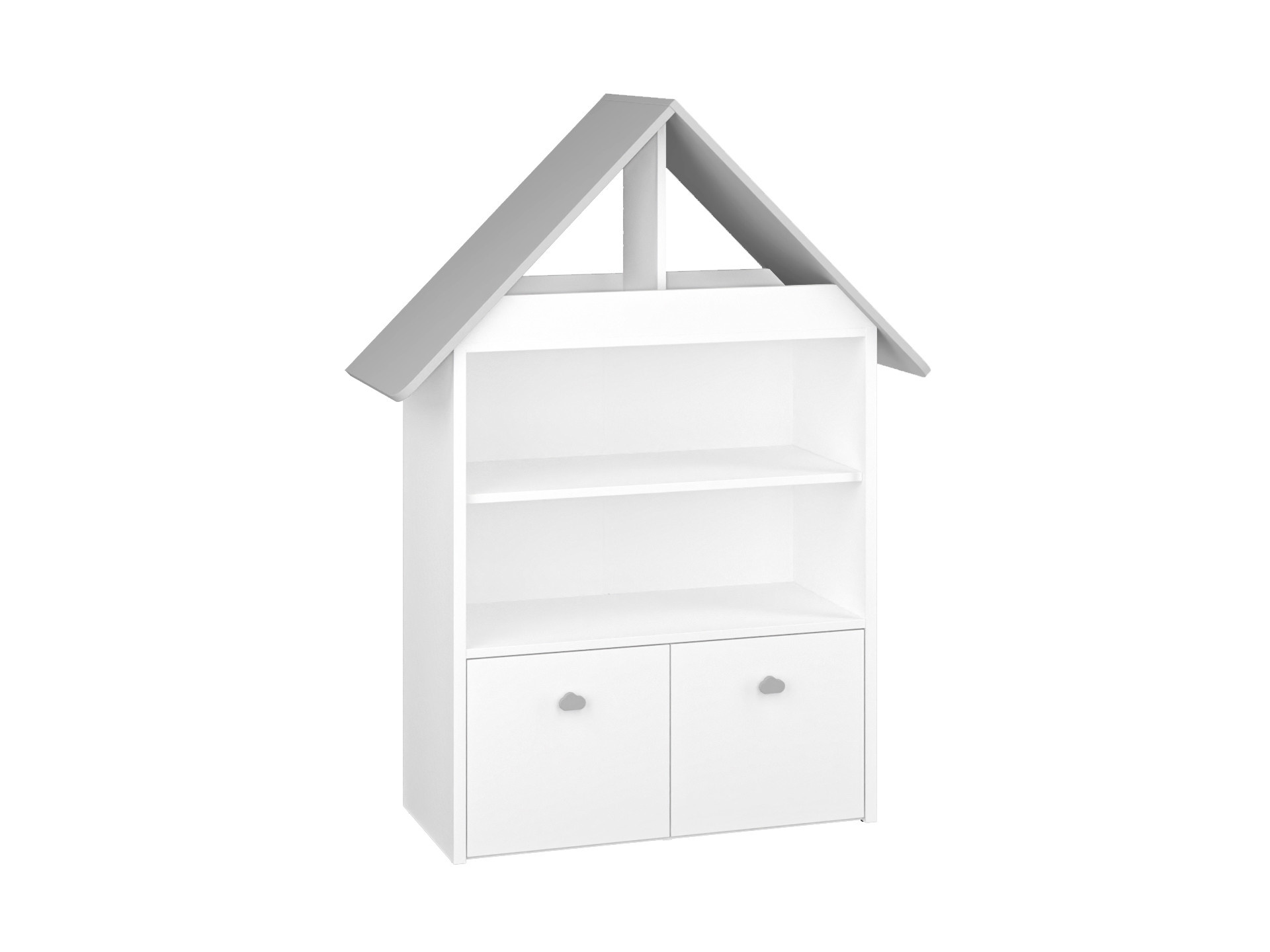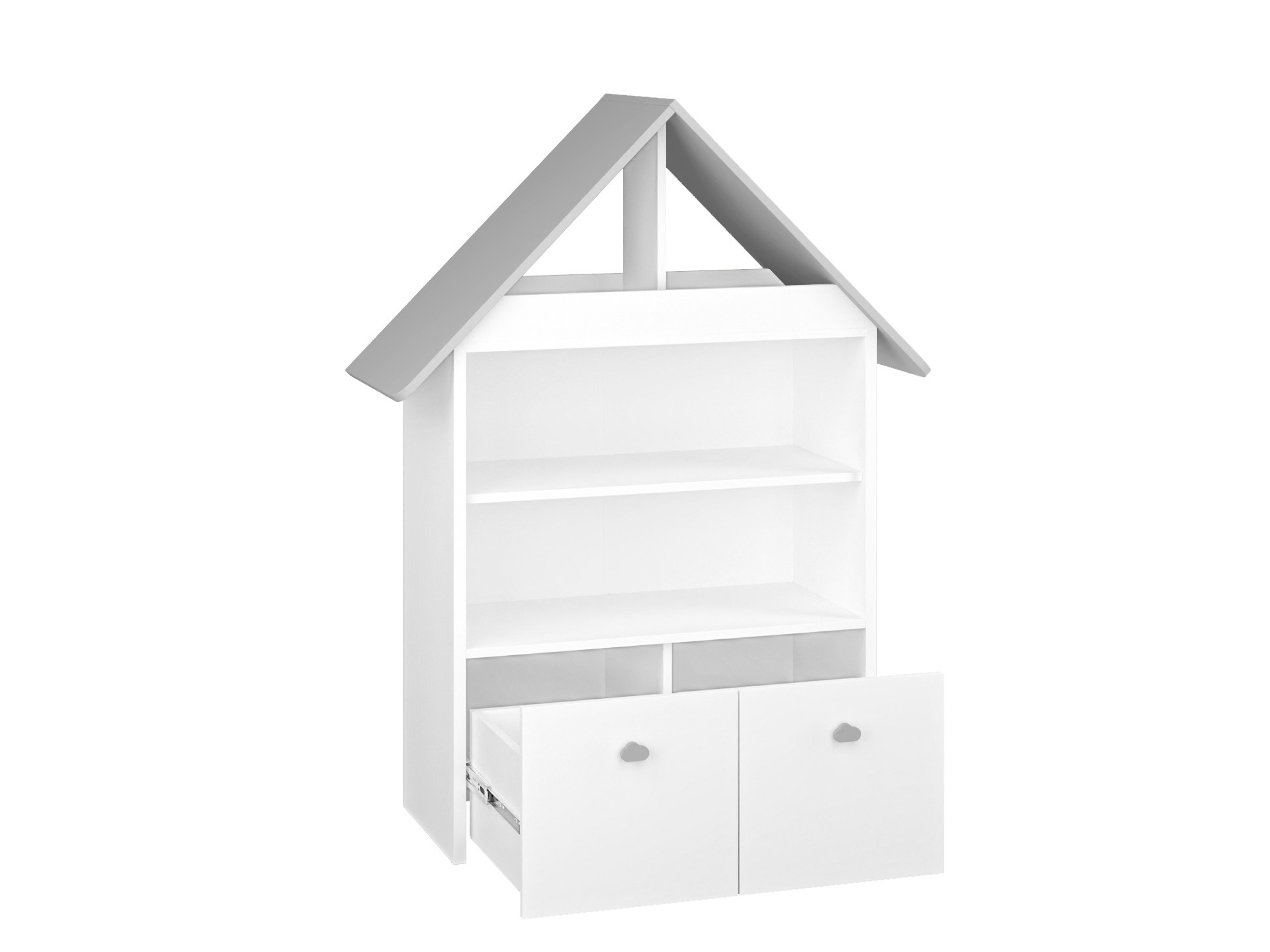 Komoda LOEN 03 je ergonomický kus nábytku s originálním designem. Tvar kvádru připomínající dům je návrhem, který podnítí fantazii vašeho dítěte a stane se místem pro mnoho kreativních her. Mezi hlavní výhody tohoto nábytku patří především dvě velmi prostorné zásuvky, do kterých můžete umístit např. dětské hračky. Komoda se navíc vyznačuje čtyřmi otevřenými výklenky, takže si dítě může vystavit své oblíbené předměty. Nábytek se vyznačuje krásnými gumovými úchytkami ve tvaru obláčku. Bílá a šedá barva zajistí volnost designu a snadno umožní zařídit dívčí i chlapecký pokoj.
