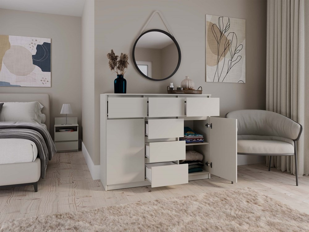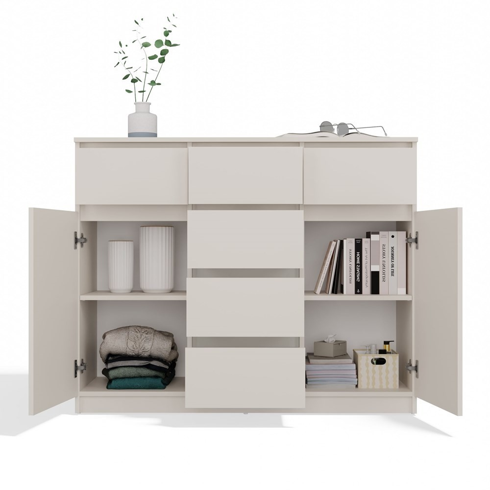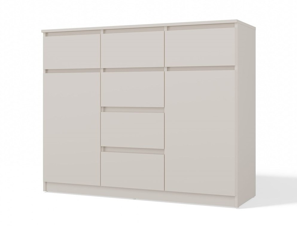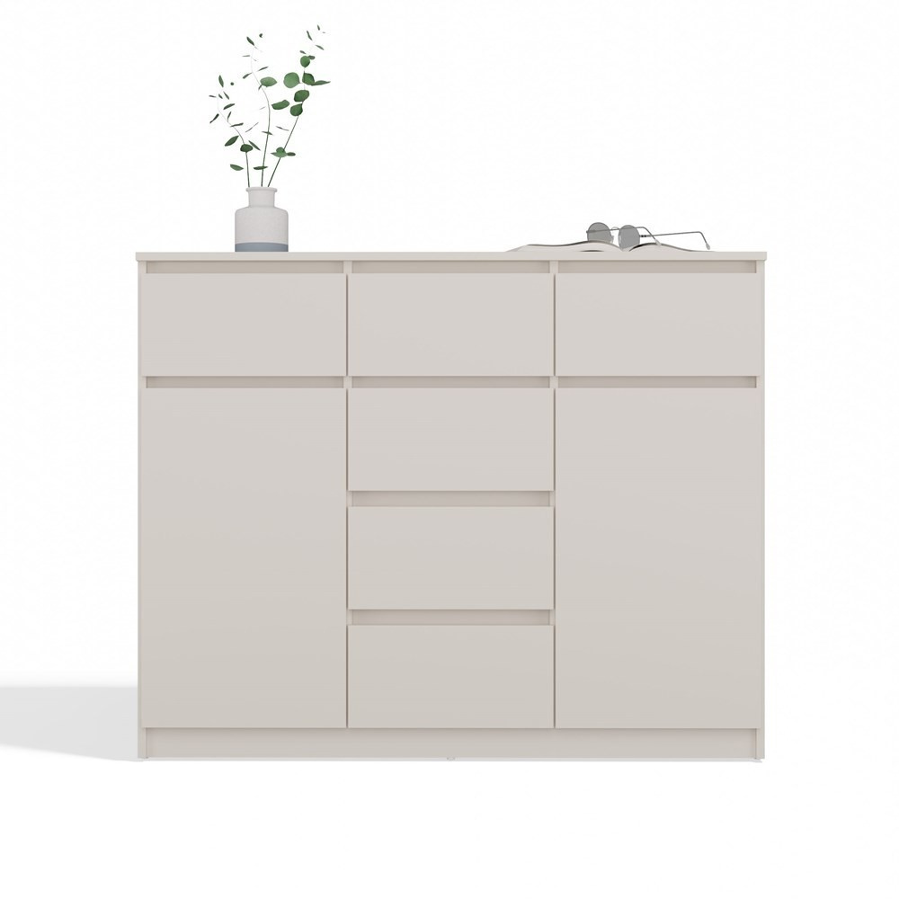 Nadčasová komoda Malvína v minimalistickém designu nabízí díky svému provedení dostatek úložného prostoru a univerzální použití v kterékoliv místnosti vašeho bytu či domu. Bezúchytková čela zásuvek a dvířek zajistí pohodlné používání a dokreslí moderní a útulný charakter vašeho interiéru. Komoda je vyrobena ze snadno udržovatelného lamina, hrany jsou zakončené vysoce odolným ABS materiálem.