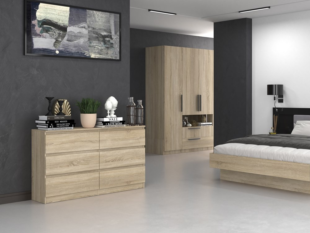 Nadčasová komoda Malvína v minimalistickém designu nabízí díky svému provedení dostatek úložného prostoru a univerzální použití v kterékoliv místnosti vašeho bytu či domu. Bezúchytková čela zásuvek zajistí pohodlné používání a dokreslí moderní a útulný charakter vašeho interiéru. Komoda je vyrobena ze snadno udržovatelného lamina, hrany jsou zakončené vysoce odolným ABS materiálem.