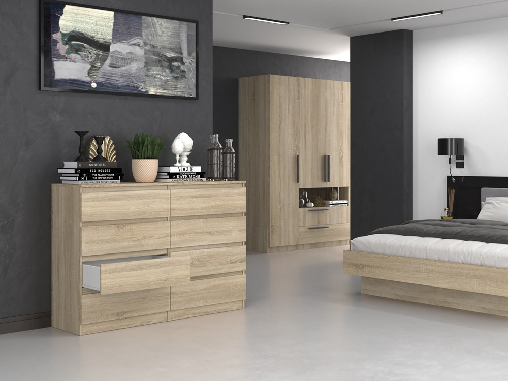 Nadčasová komoda Malvína v minimalistickém designu nabízí díky svému provedení dostatek úložného prostoru a univerzální použití v kterékoliv místnosti vašeho bytu či domu. Bezúchytková čela zásuvek zajistí pohodlné používání a dokreslí moderní a útulný charakter vašeho interiéru. Komoda je vyrobena ze snadno udržovatelného lamina, hrany jsou zakončené vysoce odolným ABS materiálem.