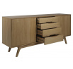Komoda Marte byla vyrobena ze dřeva a dubové dýhy pokryté vrstvou oleje, který kromě ochrany před odřením či poškozením zvýrazňuje krásu dřeva. Komoda má 4 zásuvky a 2 police. Komoda má také posuvné panely, které mohou zakrýt jak část se zásuvkami, tak i s policemi. Celý nábytek byl udržován ve stylu 70. let.