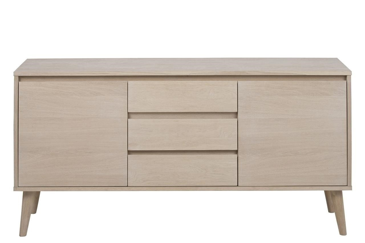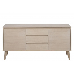 Komoda Nagano je vyrobena z dřeva a dubové dýhy. Dodatečně byl celý nábytek ošetřen vrstvou laku s bílým pigmentem, který chrání před oděrkami a znečištěním. Celá komoda je udržována v minimalistickém stylu a skvěle se hodí do eklektických interiérů. Má 3 zásuvky a dvě skříňky.