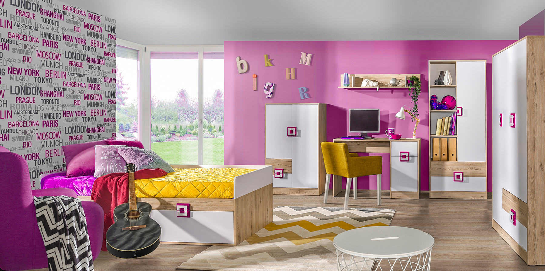 Komoda NICO 08, Světlý Dub/Bílá/Růžová