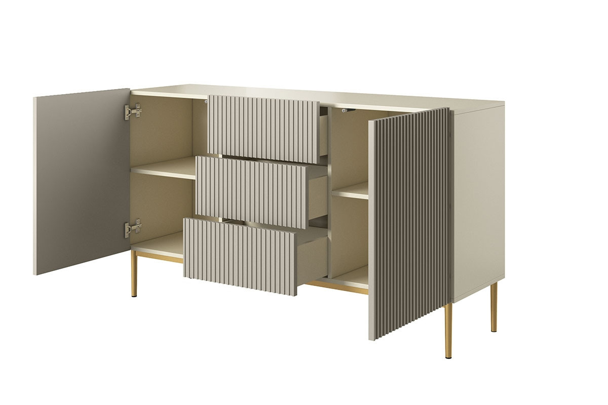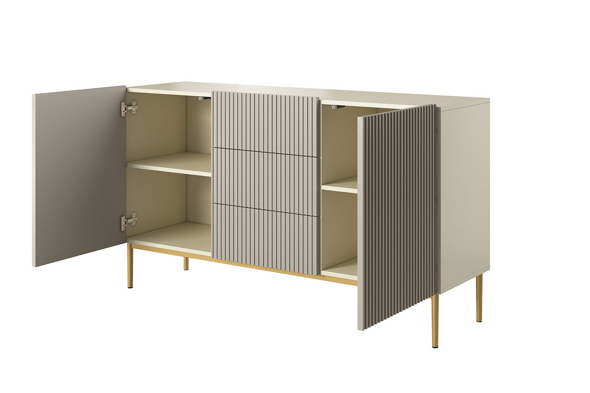 Objevte kouzlo moderního designu s komodou Nicole 150, která se stane středobodem vašeho interiéru. Tato komoda v elegantní kombinaci kašmírové a zlaté barvy přináší nejen estetický zážitek, ale také praktické řešení pro vaše úložné potřeby.