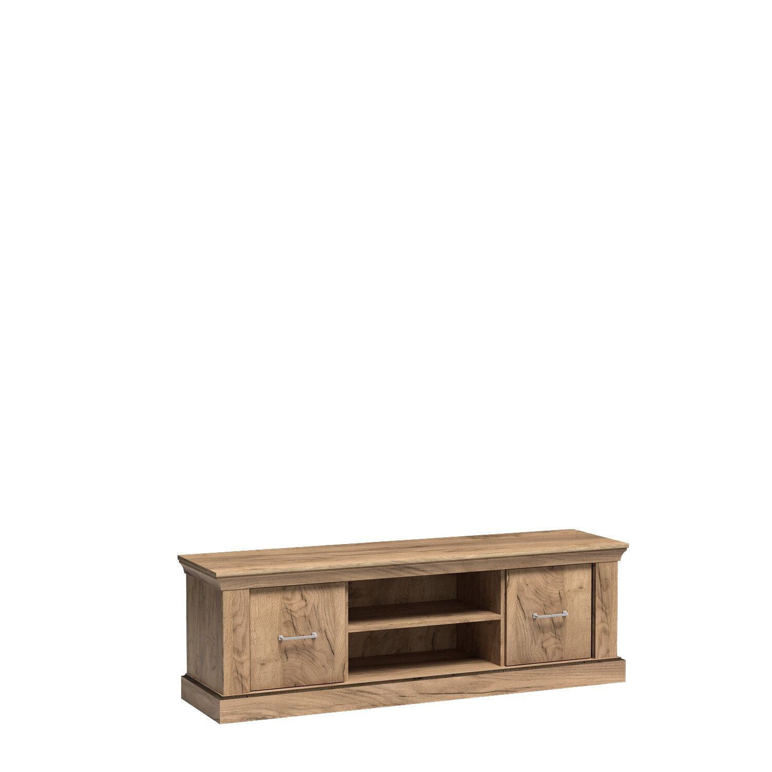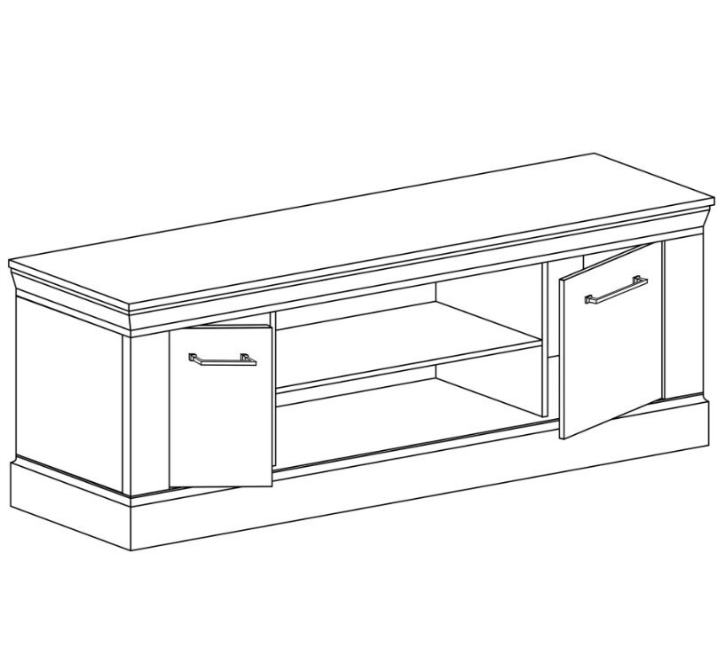 Velká a prostorná RTV skříň. Je ideální pro televizi nebo rádio a budou na ní dobře vypadat ozdoby a rámečky na fotografie. Má dvě skříňky po stranách s prázdným prostorem uprostřed a poličku uprostřed ideální pro dekodér, vystavení suvenýrů nebo porcelánu. Skříňka má také zabudovanou možnost tichého zavírání, která jí dodává na jemnosti. K dispozici ve dvou barvách.