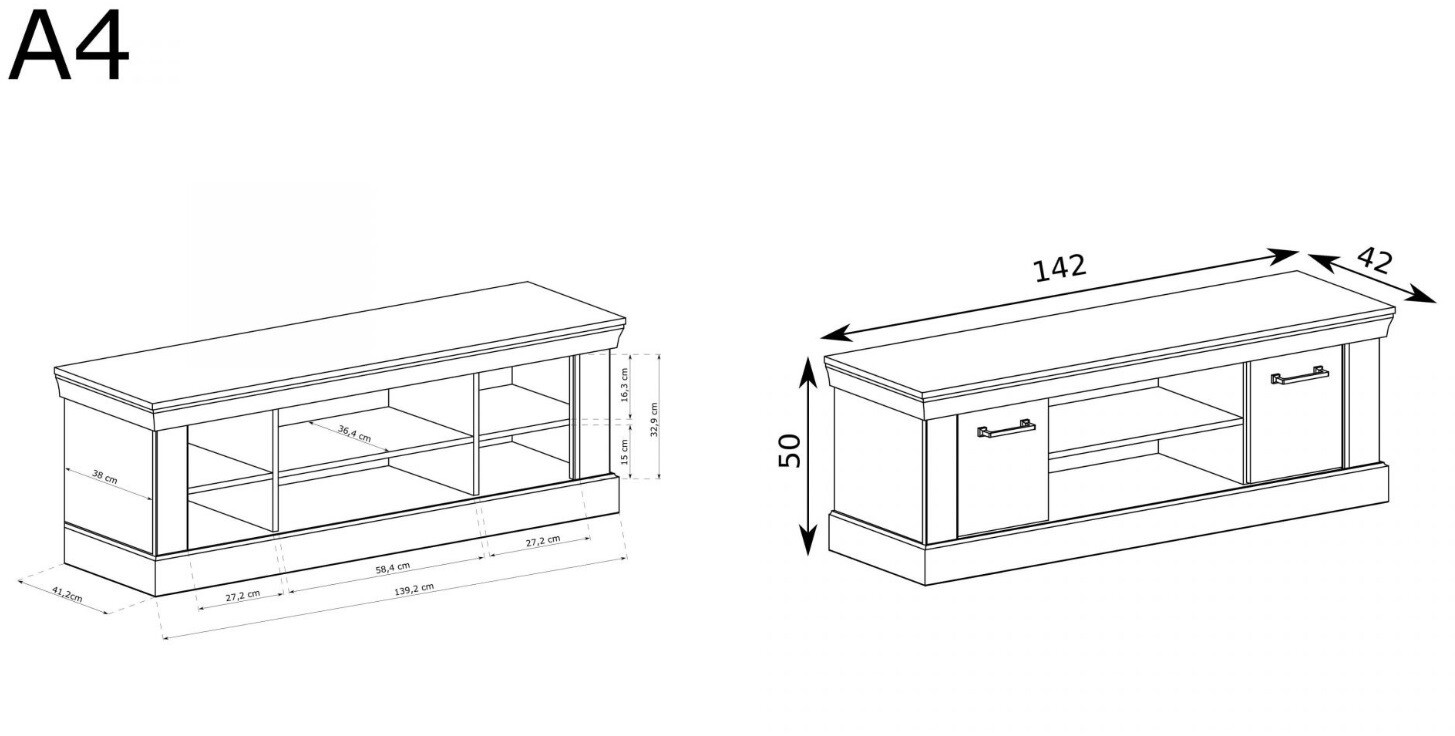 RTV skříňka z kolekce Antica, ideální do obývacího pokoje nebo ložnice, zapadne do každého interiéru. Má jednu velkou polici uprostřed skříňky, ideální pro vystavení mnoha věcí, ozdob, dobře se hodí i na dekodér. Po stranách jsou dvě skříňky s policemi, které rozdělují prostor tak, aby byl využit na 100 %. Kovové úchytky a tiché zavírání skříněk dodávají eleganci, a jemnost. K dostání ve dvou barevných provedeních.