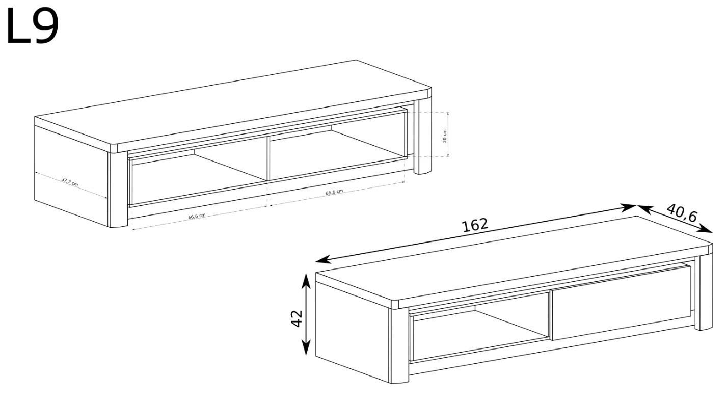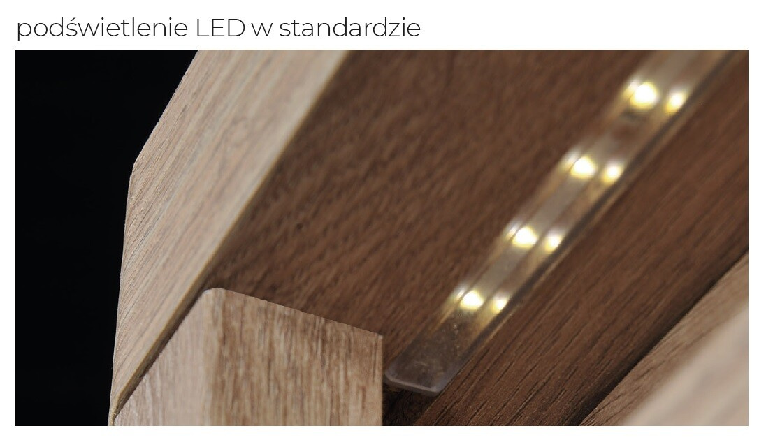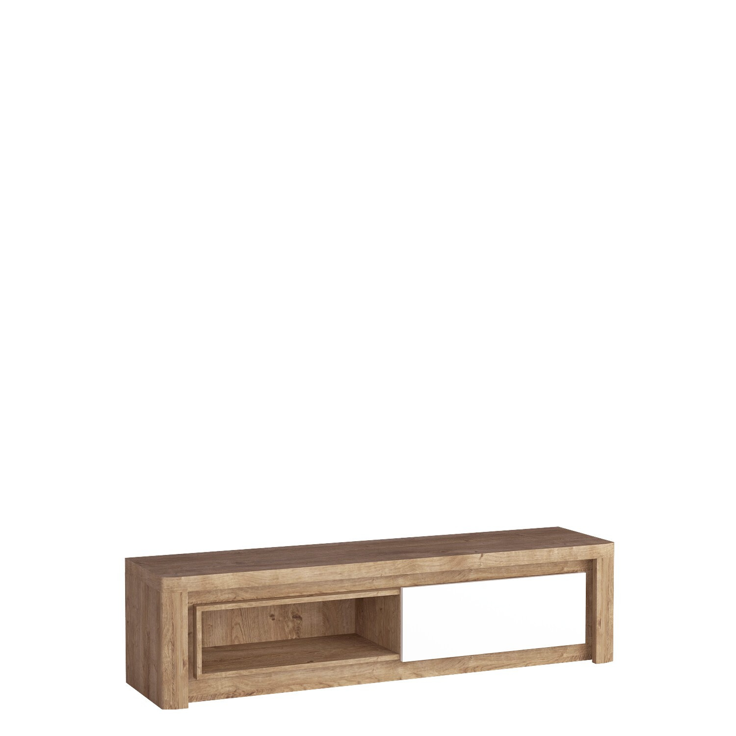Velká moderní skříňka pod televizor. Přírodní barevnost korpusu a čel se hodí do každého interiéru. Skříňka má na pravé straně uzavřenou skříňku s výklopným čelem, otevíraným směrem dolů. Na levé straně je otevřená police, na kterou můžete umístit set-top box nebo hudební zařízení. Televizní prostor v obývacím pokoji je místem, kde trávíme hodně času. Je důležité, abychom se v tomto místě odpočinku cítili dobře. Osvětlení tohoto kusu nábytku nám pomůže ukrátit čas a můžeme ho využít i za soumraku. Skříňka bude vypadat skvěle s dalšími kusy ze systému, čímž vytvoří společný celek v krásných barvách.