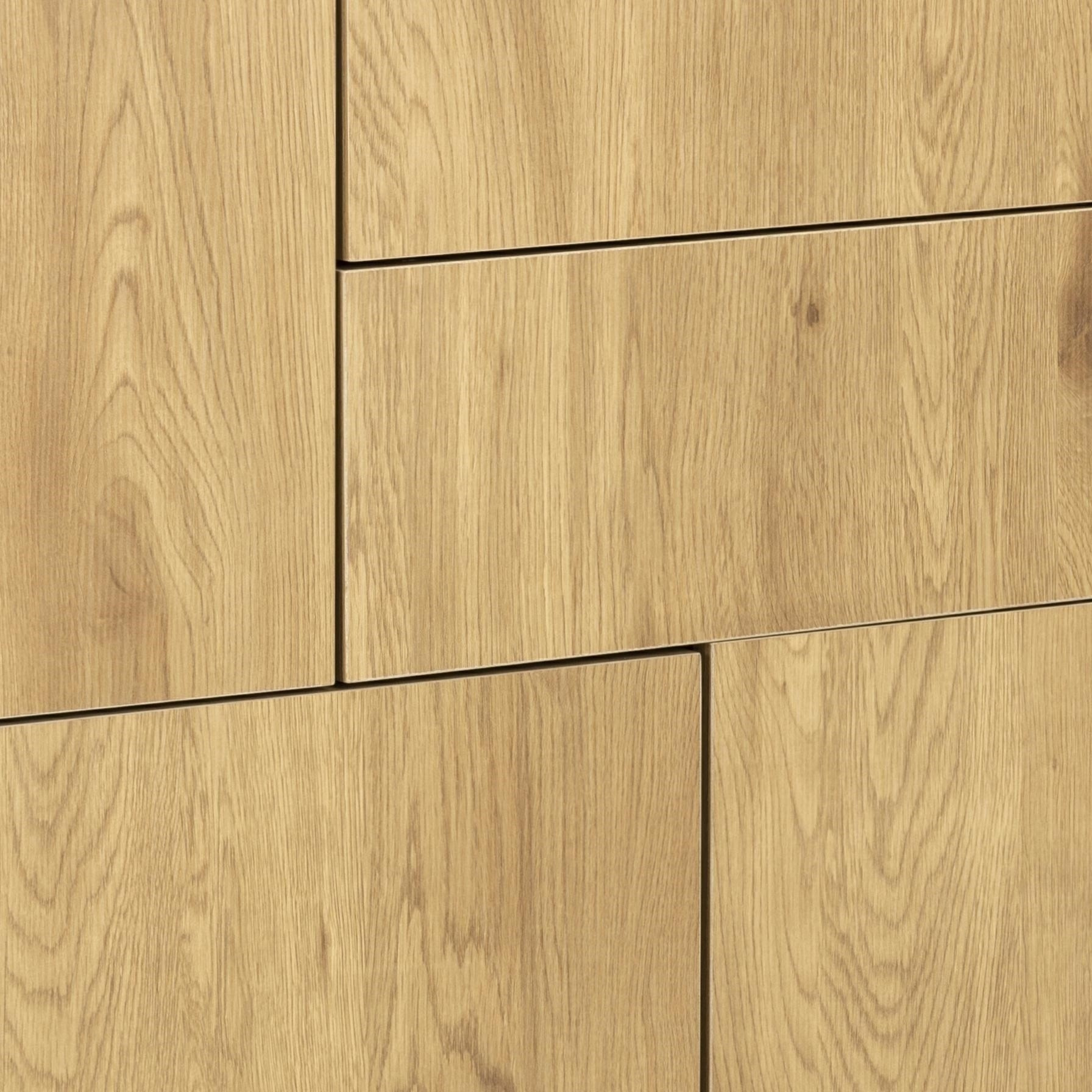 Komoda Seaford je dalším nábytkem z industriální kolekce Seaford. Komoda, složená ze dvou prostorných zásuvek a tří skříněk s dvířky, byla postavena na 4 černých matných nohách. Čela komody byla vyrobena z MDF potaženého dýhou se strukturou přírodního dubu. Hmotnost: 33 kg. Rozměry kartonu: 24,1 cm x 89,5 cm x 46 cm