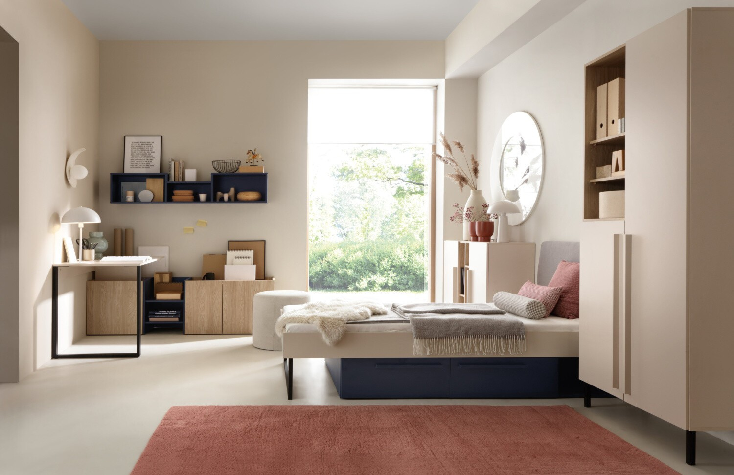 Systém SERGIO je vyroben ve dvou barevným provedeních - Béžově písková/Dub olejovaný/Královská modř a v provedení Eukalyptus/Dub Baltic Dune/Černý Onyx.