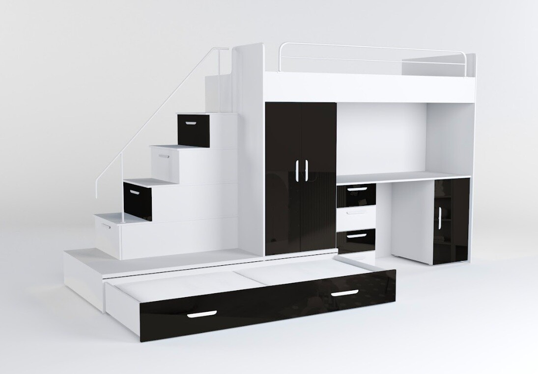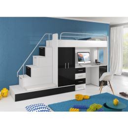 Tato postel je určená především pro osoby, které ocení moderní design, funkčnost a spoustu úložných prostorů. Patentované provedení a stabilní konstrukce postele Vám zaručuje bezpečí pro Vaše děti. Schody v sobě ukrývají spoustu úložného prostoru. Barevné provedení dvířek je v lesku a schůdky lze objednat jak na pravou tak i levou stranu (stranu schodů určujeme z čelního pohledu). Nosnost lůžka je 100 kg, nosnost schodu je 55 kg. Pod postelí se nachází psací stůl se šuplíky i šatní skříň včetně velkého výsuvného úložného šuplíku. K této posteli je možnost dokoupit další nábytek a utvořit tak krásný dětský pokoj. Uvedená úvodní fotografie je v Levém provedení.