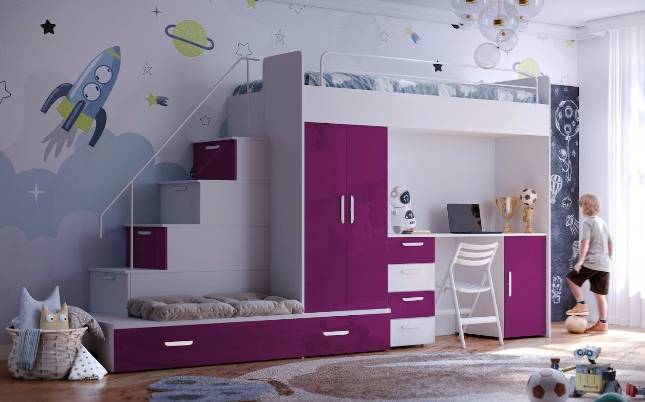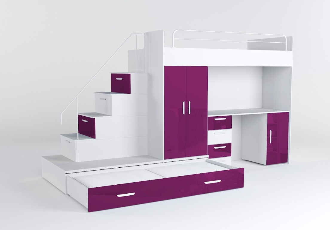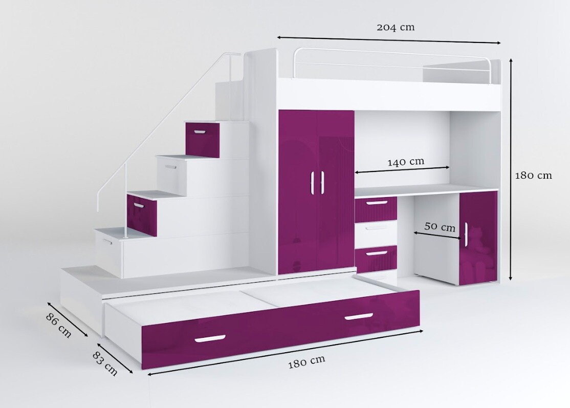 Tato postel je určená především pro osoby, které ocení moderní design, funkčnost a spoustu úložných prostorů. Patentované provedení a stabilní konstrukce postele Vám zaručuje bezpečí pro Vaše děti. Schody v sobě ukrývají spoustu úložného prostoru. Barevné provedení dvířek je v lesku a schůdky lze objednat jak na pravou tak i levou stranu (stranu schodů určujeme z čelního pohledu). Nosnost lůžka je 100 kg, nosnost schodu je 55 kg. Pod postelí se nachází psací stůl se šuplíky i šatní skříň včetně velkého výsuvného úložného šuplíku. K této posteli je možnost dokoupit další nábytek a utvořit tak krásný dětský pokoj. Uvedená úvodní fotografie je v levém provedení.