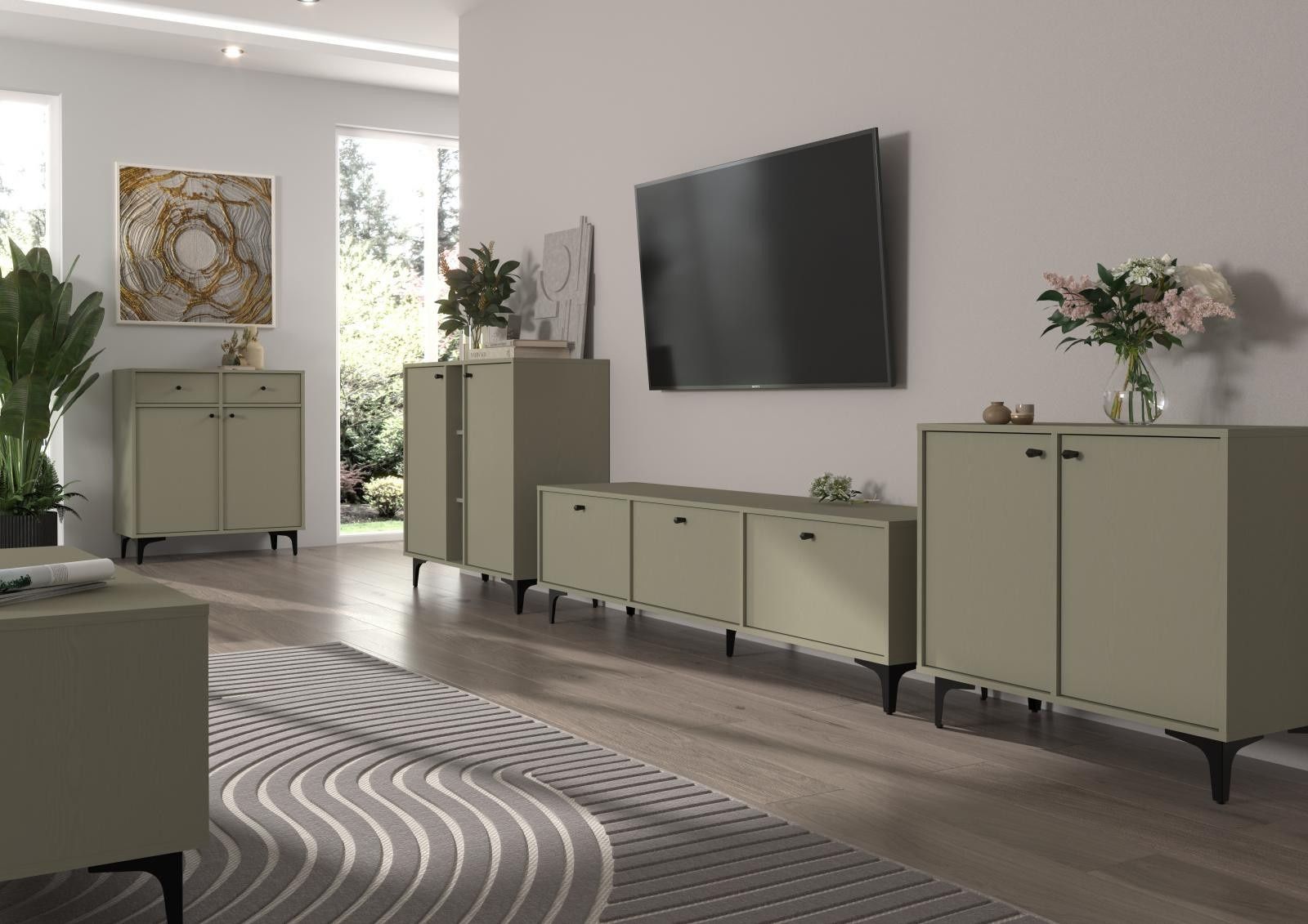Série Tomila nabízí noční, TV i konferenční stolky, vitríny a komody v široké škále tvarů, barev a typů noh.