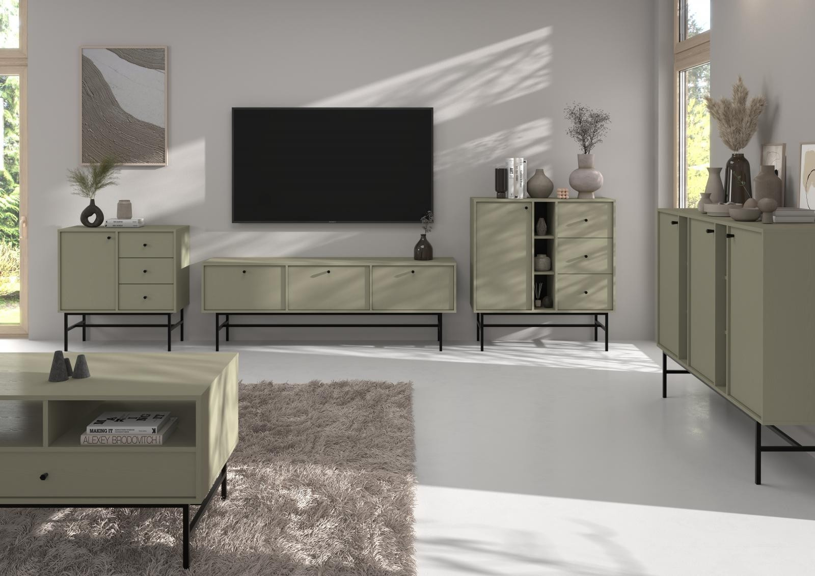 Série Tomila nabízí noční, TV i konferenční stolky, vitríny a komody v široké škále tvarů, barev a typů noh.