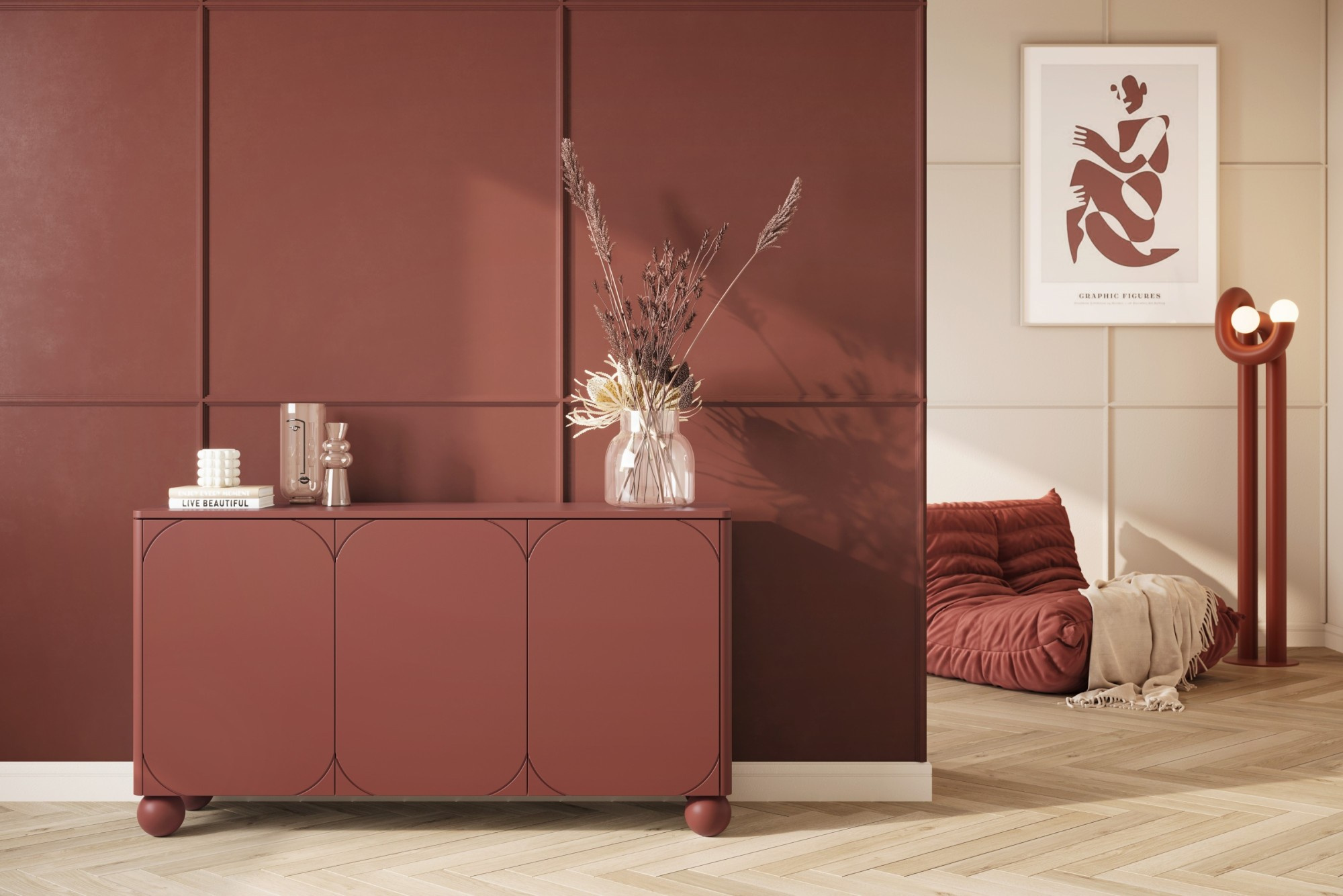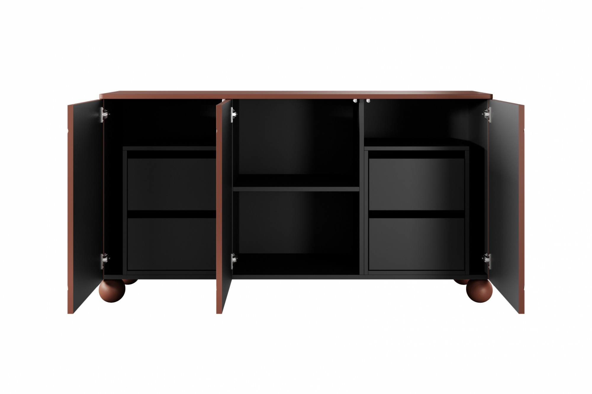 Třídveřová komoda se čtyřmi skrytými zásuvkami Sonatia II 150 cm - burgund, Šířka: 150, Výška: 82, Hloubka: 45, Výška nožek: 12, Montáž:
