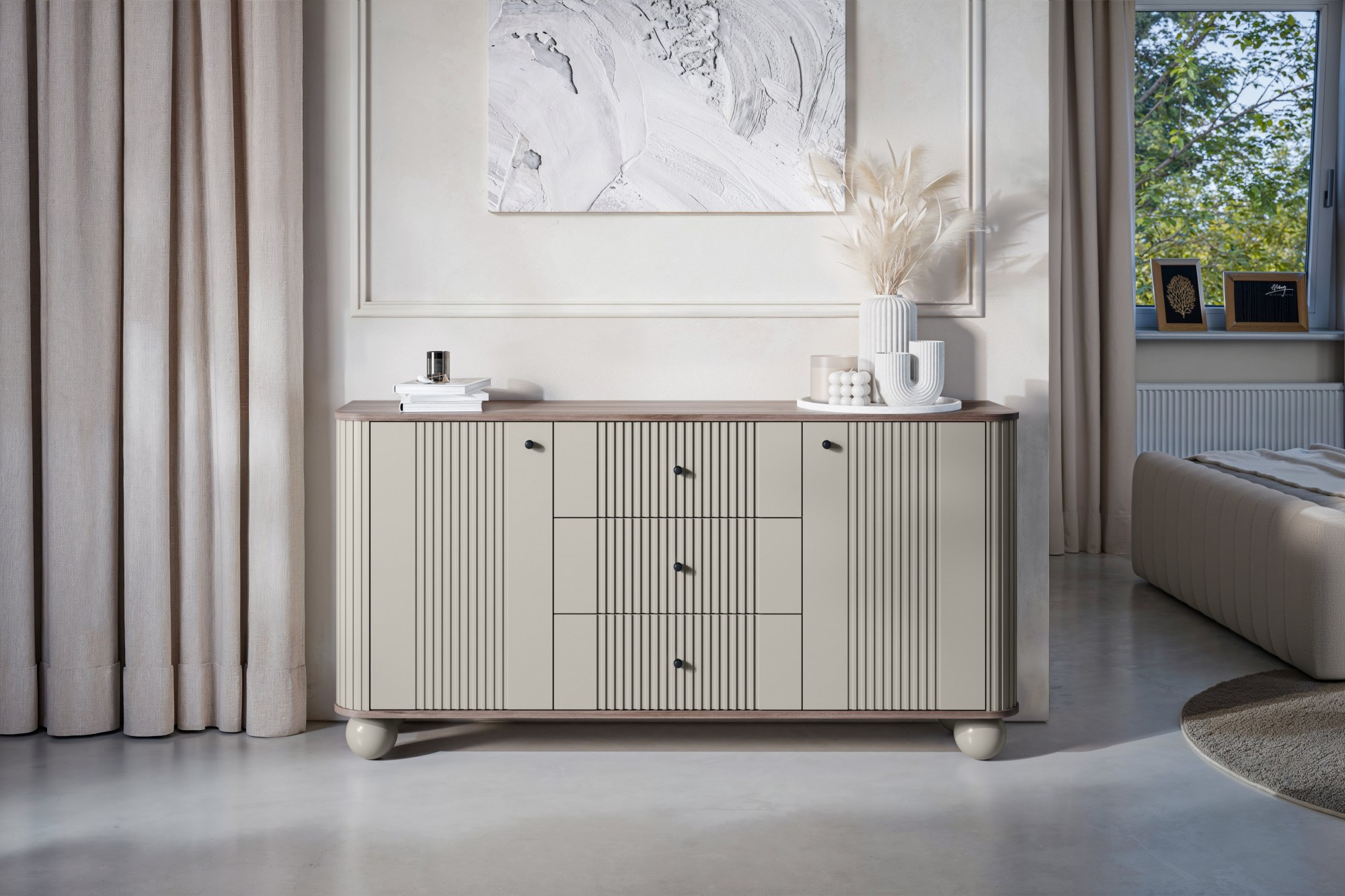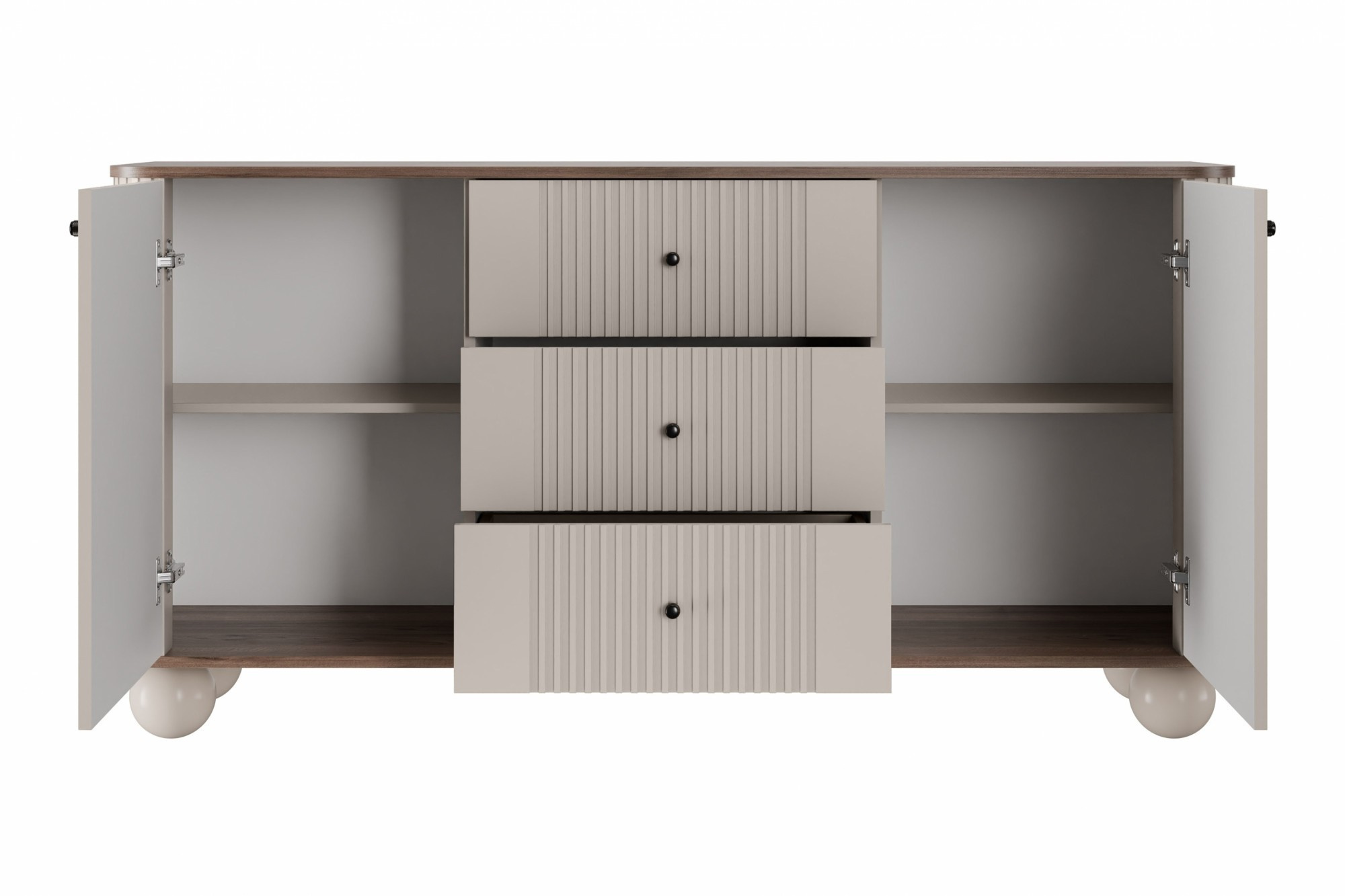 Komoda se zásuvkami Vesper 160 cm - kašmír / ořech / černé úchyty / nohy koule, Šířka: 160, Výška: 82, Hloubka: 38, Výška nožek: 12, Hloubka desky: , Montáž: