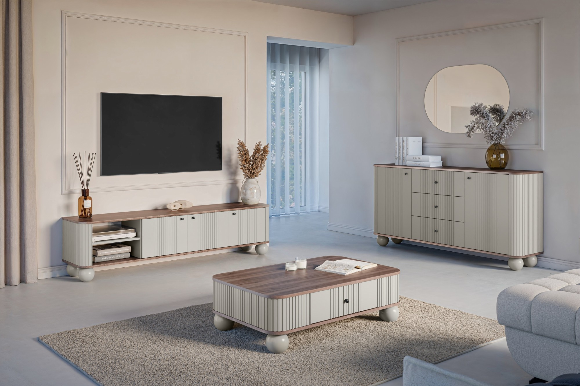 Komoda Vesper, kašmír / ořech / černé úchyty / kulaté nohy