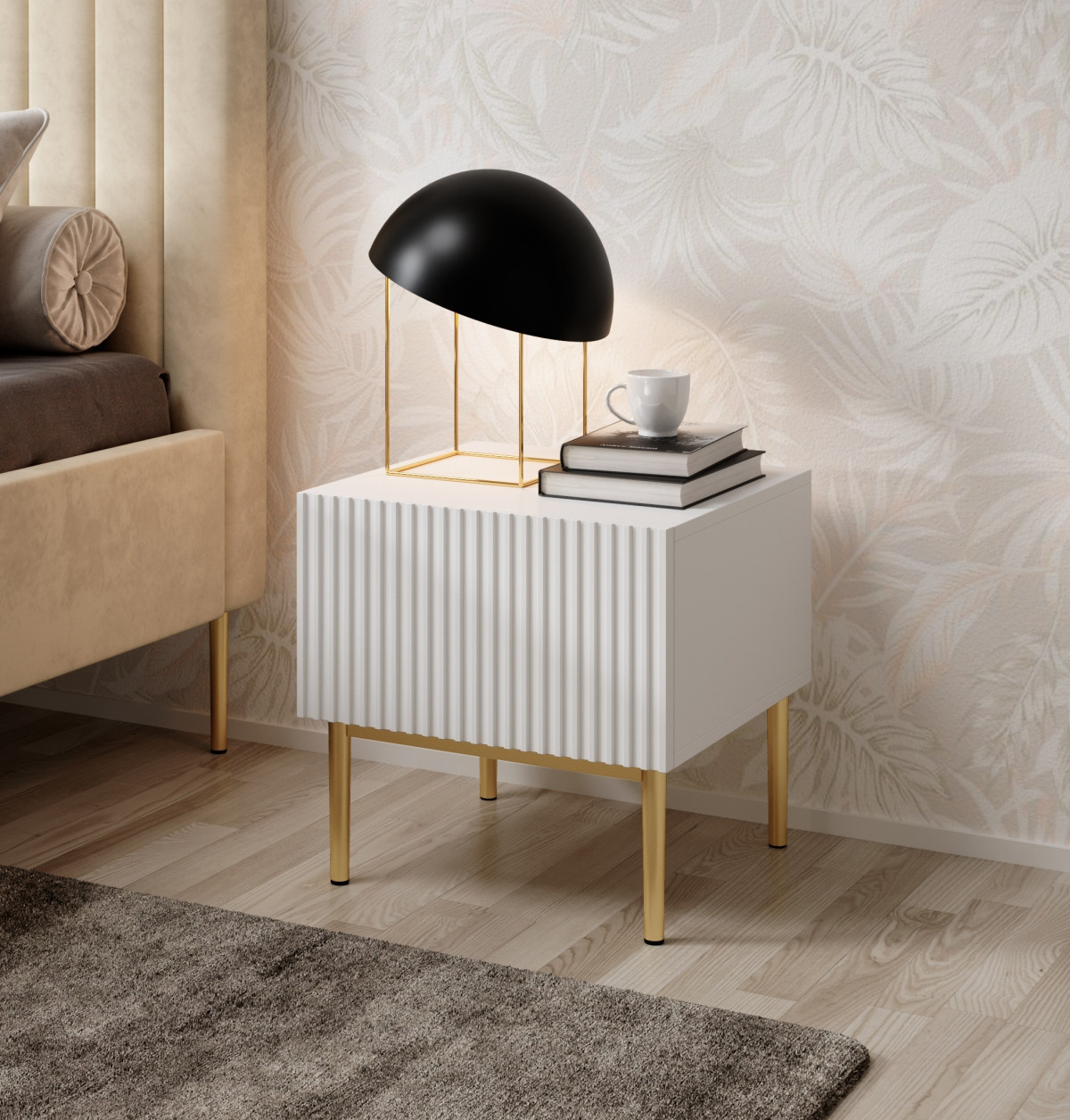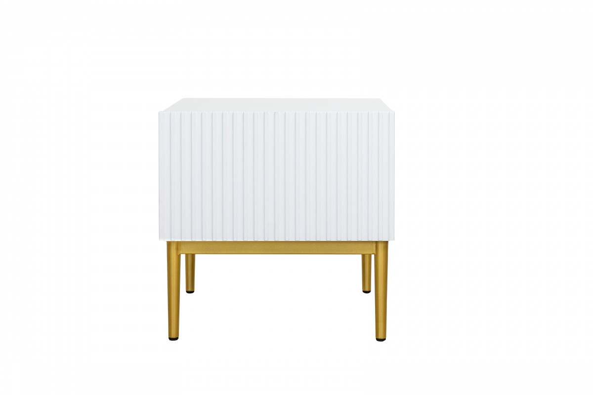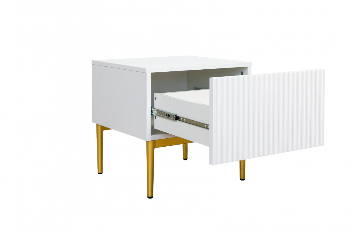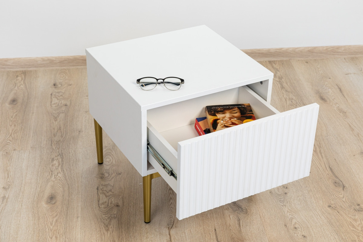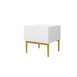 Zařizujete si ložnici svých snů? Hledáte noční stolek, který by byl praktický a zároveň dekorativní? Co třeba tento návrh v bílém odstínu? Žlábkované čelo v kombinaci se zlatými nohami mu dodává velmi reprezentativní charakter. Nábytek je vybaven prostornou zásuvkou s místem pro praktické předměty. Lze ji otevřít vytažením přední části. Tento noční stolek je odrazem dobrého vkusu. Okouzlila i vás? Není divu.sada nočních stolků Nicole 2 ks. se zásuvkou na kovových nohách - bílý mat / zlaté nohy , šířka: 46, výška: 45, hloubka: 45, výška nohou: 20.