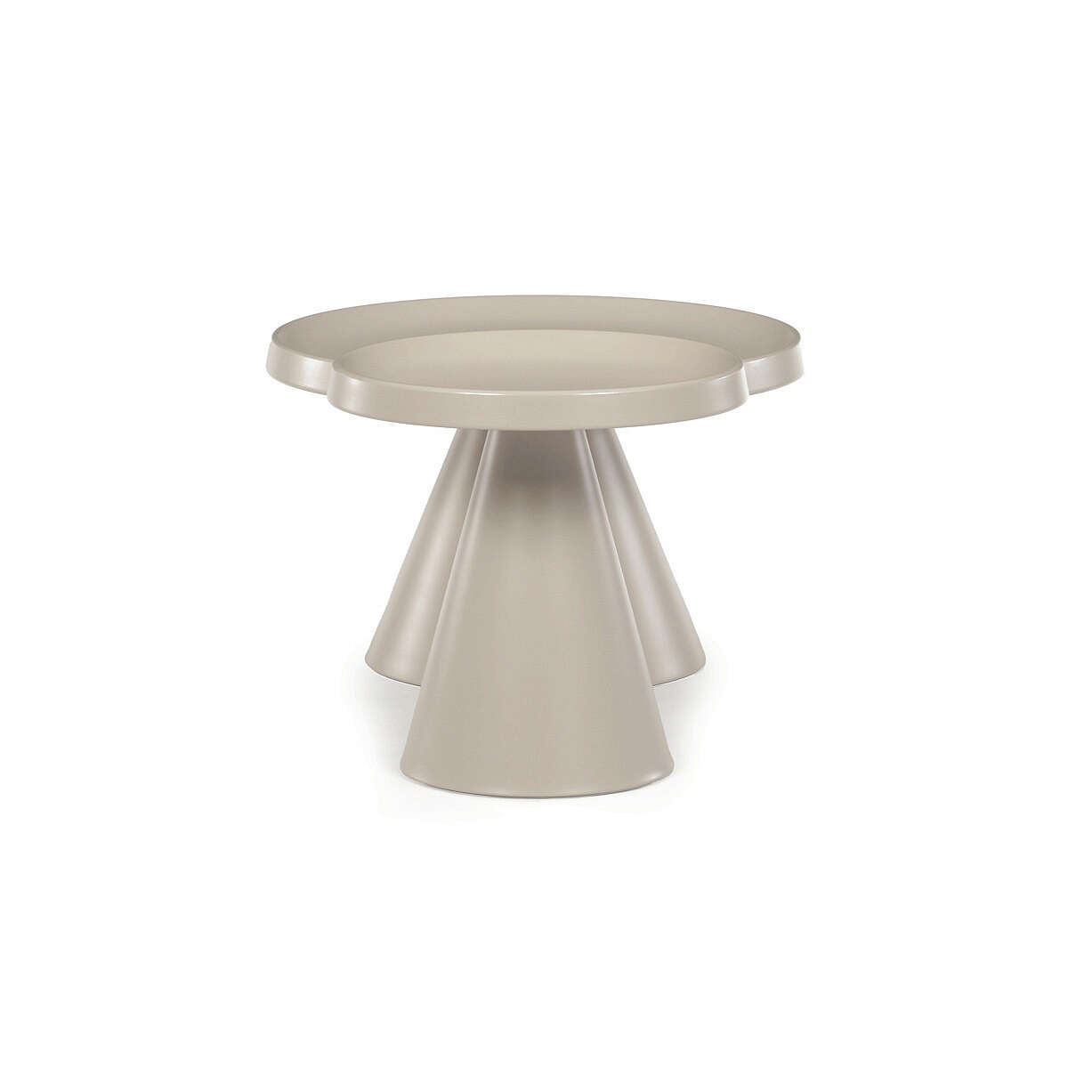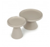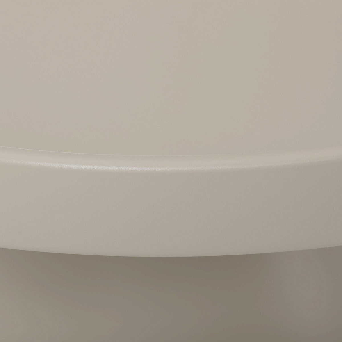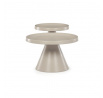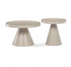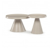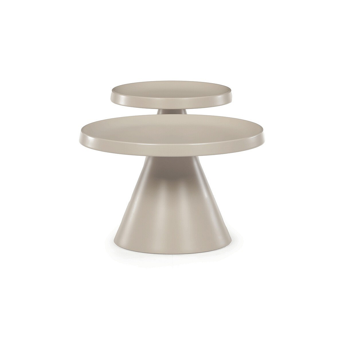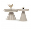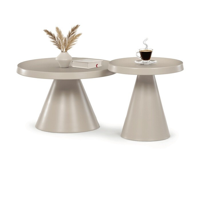 Sada dvou konferenčních stolů v béžovém matném provedení nabízí kombinaci funkčnosti a moderního designu. Obě desky i nohy jsou vyrobeny z kovu, což zajišťuje stabilitu a dlouhou životnost, přičemž povrchová úprava usnadňuje údržbu. Větší stůl má průměr 68,5 cm a výšku 43,5 cm, menší pak průměr 49 cm a výšku 49,5 cm, což umožňuje variabilní uspořádání v prostoru. Dekorativní hrany desek podtrhují jednoduchý a čistý vzhled, který se hodí do moderních interiérů. Pevná kovová podnož zaručuje stabilitu při běžném používání.